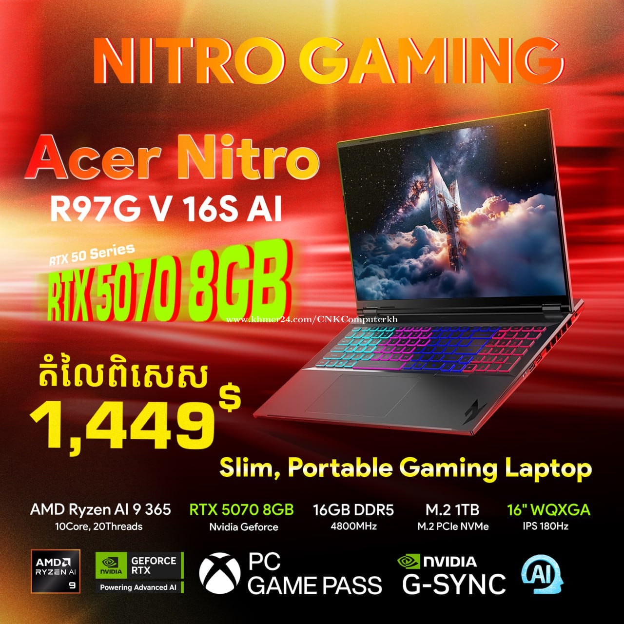 ๐๐๐๐ซ ๐๐" ๐๐ข๐ญ๐ซ๐จ ๐ ๐๐๐ ๐๐ ๐๐๐๐ --------------------------------- - CPU : AMD Ryzenโข AI 9 365 (10C/20T) - RAM : 16GB DDR5 = 32GB add $90 - Storage : 1TB M.2 PCIe - Display : 16" WQXGA IPS 180Hz - GPU : NVIDIA RTX 5070 8GB GDDR7 - Windows 11 Pro Recommendation - RGB 4 Zones Backlight - 2.1 kg | Color : Obsidian black ๐๐๐ ๐๐จ๐ฆ๐ฉ๐ฎ๐ญ๐๐ซ (แแแแผแแแแแแปแแถแแแแแ) โ๏ธ แแแถแแแแแแ 0930957xxxClick To Call 77 ๐ฌ Telegram : t.me/cnkcomputer93 ๐ Website: https://cnkcomputer.com/