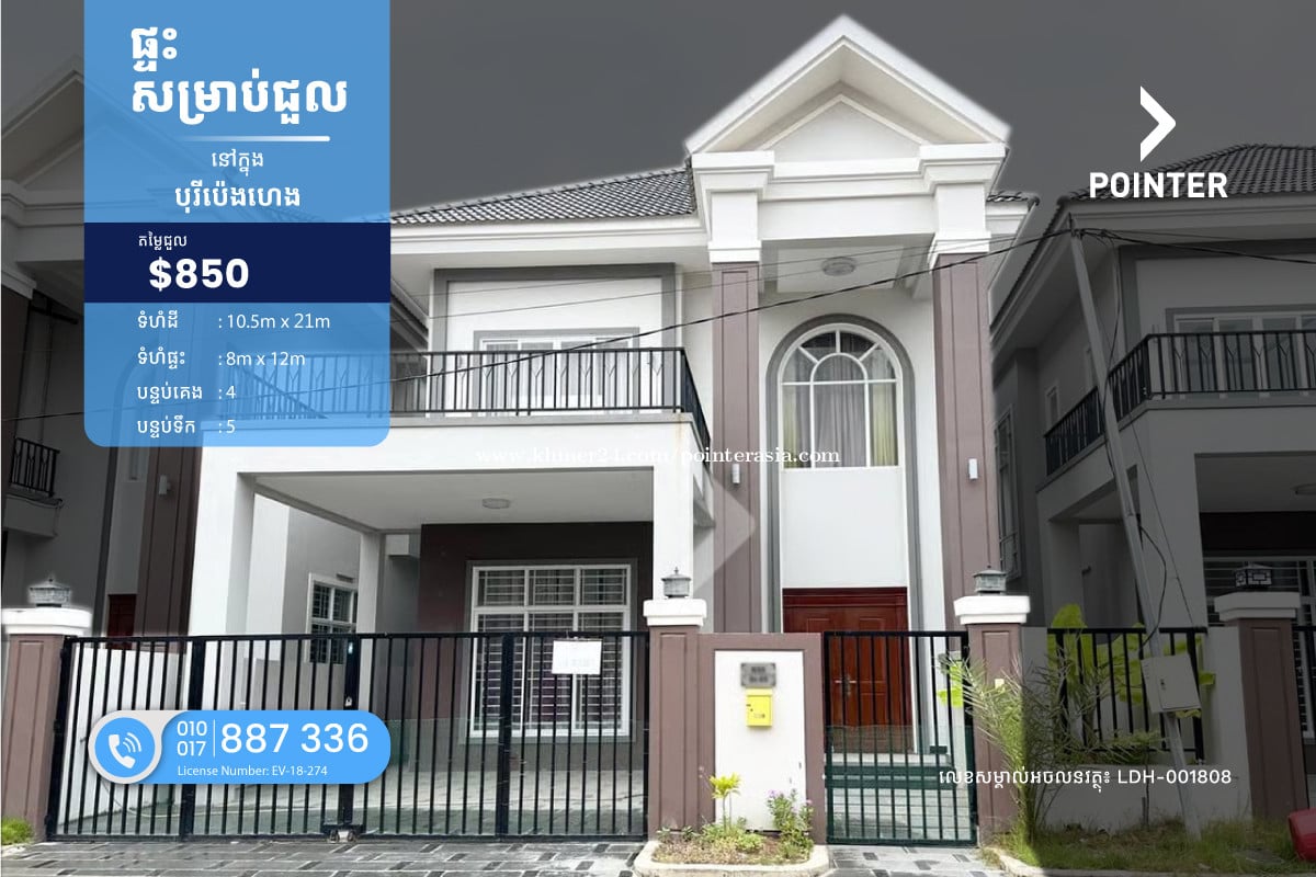 💸តម្លៃជួល | Asking Rent: US$850 ✅ទំហំដី | Land Size : 10.5m x 21m ✅ទំហំផ្ទះ | House Size : 8m x 12m ✅បន្ទប់គេង | Bedroom: 4 ✅បន្ទប់ទឹក | Bathroom: 5 ✅ចំណត | Parking: 2 📍បុរីប៉េងហេង 📌លេខកូដអចលនទ្រព្យ: LDH-001808 សម្រាប់ពត័មានបន្ថែម និងការចុះពិនិត្យផ្ទាល់ សូមទំនាក់ទំនងមកកាន់យើងខ្ញុំតាមរយៈ៖ ☎️Hotline +8551088xxxClick To Call6 ☎️ឬ WhatsApp/telegram +8551788xxxClick To Call6 👉 Telegram៖ t.me/pointerproperty 🔗Link to property: https://pointer.asia/e9Uf8