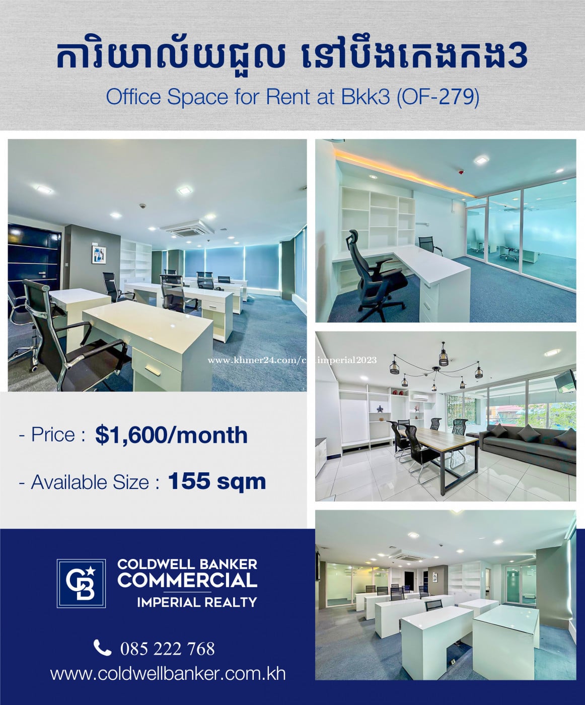 -Available size : 155 sqm -Price : 1600$ /month -Good location at Sangkat Bkk3 -With fitted out and ready to move in ----------------------------------------------------- -Management Fee: Free -Free weekly cleaning -Working desks -Meeting room -Free internet -Parking : Free 1 car and free motors (additional car parking 50$/month) -Electric : 0.27$/kwh -Water : 0.3$/m3 -VAT : excluding โ๏ธแแแแแถแแแแแแแแถแแแแขแทแ แแทแแแผแแแถแแแแแแแแแผแแแแแถแแแแแแแ โ๏ธ 085222xxxClick To Call (Telegram) โ๏ธ 069993xxxClick To Call ๐Telegram : https://t.me/imperialcomercial ๐Website : https://imperialrealty.com.kh #ColdwellBankerCambodia