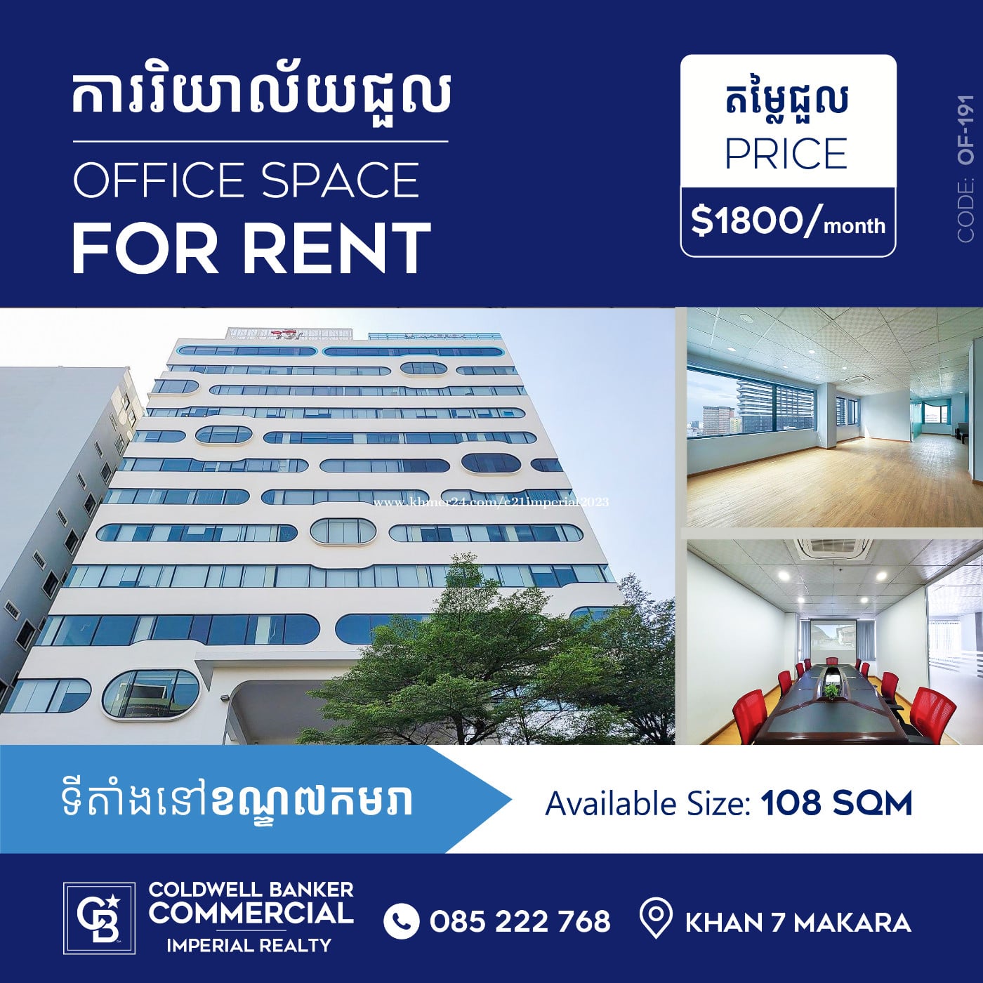 ๐ขOffice for rent at Khan 7 Makara (OF-191) -Available Size : 108 sqm -Price : 1800$/sqm -Floor : 6 -Management fee : Included ---------------------------------------- -Lease term : 2 year -Deposit : 3 months -Electricity fee: 0.25$/Kwh -Water fee: Free -Parking : negotiate -Additional parking : 55$/month for a car , 4.95$/30 coupons for motorbikes -VAT : excluded -Security 24 h -Ready move in ---------------------------------------- โ๏ธแแแแแถแแแแแแแแถแแแแขแทแ แแทแแแผแแแถแแแแแแแแแผแแแแแถแแแแแแแ โ๏ธ085222xxxClick To Call | 069993xxxClick To Call ๐Telegram : https://t.me/imperialcomercial ๐Website : https://imperialrealty.com.kh