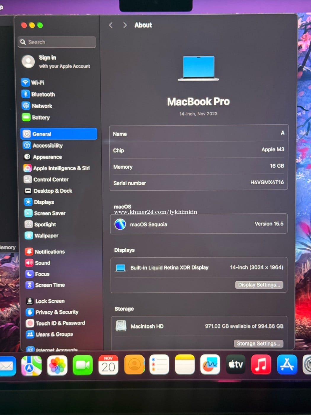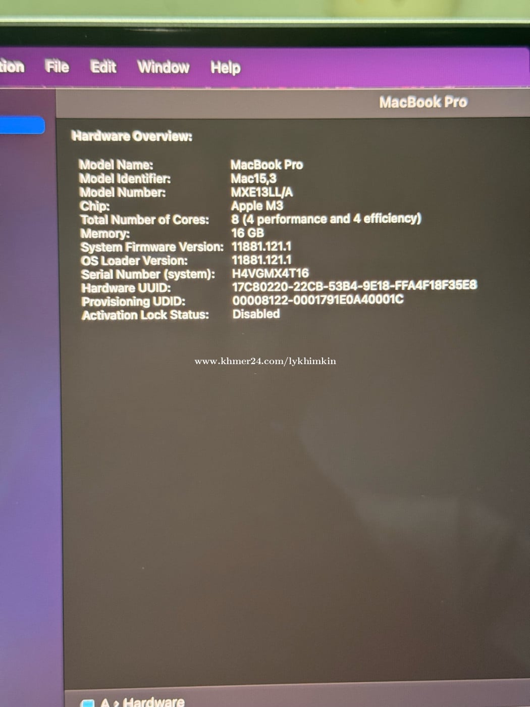 ๐ป MacBook Pro M3 2023 (14-Inch) 16GB / 1TB SSD | 100%๐ Specifications: โข Model: 14-inch, Nov 2023 MacBook Pro โข Chip: Apple M3 โข Memory: 16 GB โข Display: Built-in Liquid Retina XDR Display, 14-inch (3024 x 1964) โข Storage: 1TB SSD) โข Operating System: macOS Sequoia Version 15.5 โข Battery Condition: 100% โจ Specs: โข Chip: Apple M3 โข Memory: 16 GB RAM โข Storage: 1TB SSD โข Display: Stunning 14-inch Liquid Retina XDR Display (3024 x 1964) โข System: Running the latest macOS Sequoia โก๏ธ Features: โข Exceptional Performance: M3 Chip for demanding professional workflows. โข Extended Battery Life: (As per your request) 100% Battery Health. โข Professional-Grade Display: Liquid Retina XDR with P3 wide color and ProMotion technology. โข Ready for pick-up or delivery! ๐ Contact: โข ๐ฒ Telegram: https://t.me/LykhimKin โข โ๏ธ Cellcard: 092306xxxClick To Call | Smart: 087417xxxClick To Call
