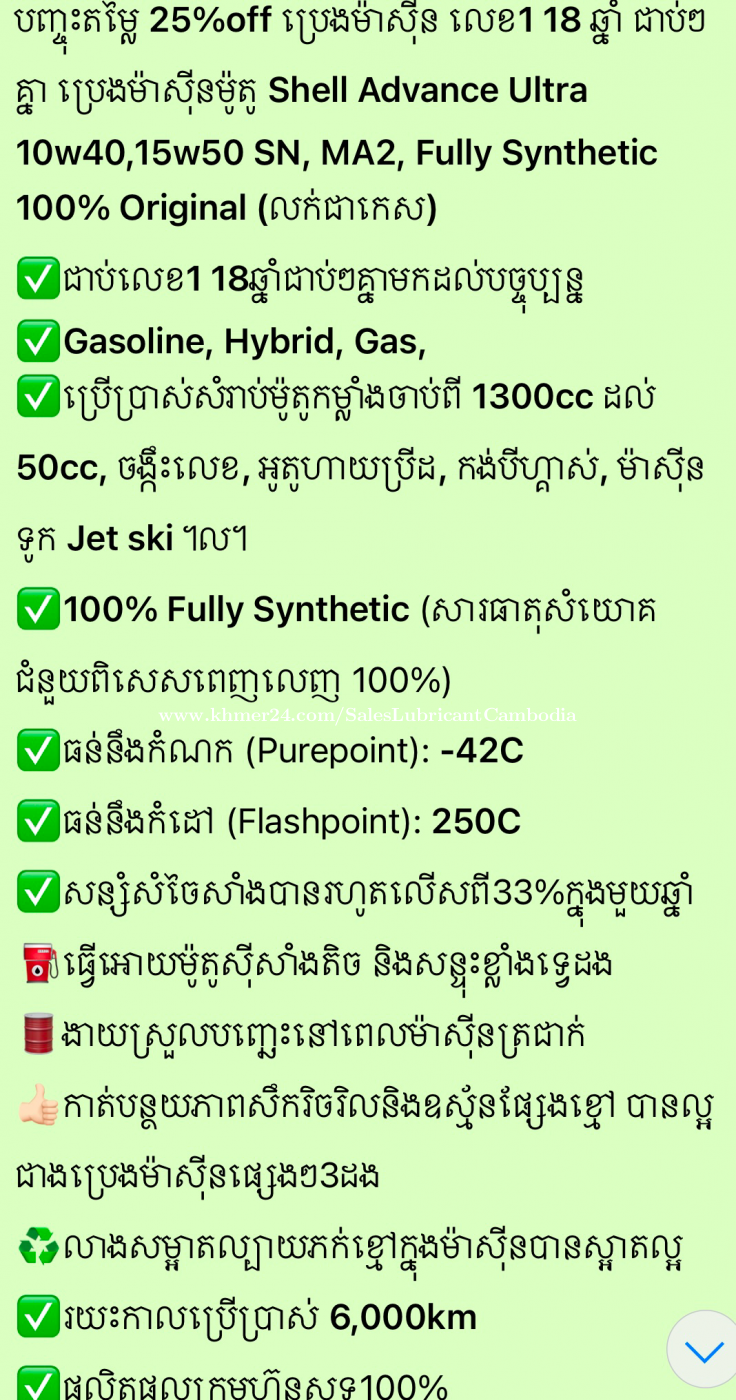 បញ្ចុះតម្លៃ 25%off ប្រេងម៉ាស៊ីន លេខ1 18 ឆ្នាំ ជាប់ៗគ្នា ប្រេងម៉ាស៊ីនម៉ូតូ Shell Advance Ultra 10w40,15w50 SN, MA2, Fully Synthetic 100% Original (លក់ជាកេស) ✅ជាប់លេខ1 18ឆ្នាំជាប់ៗគ្នាមកដល់បច្ចុប្បន្ន ✅Gasoline, Hybrid, Gas, ✅ប្រើប្រាស់សំរាប់ម៉ូតូកម្លាំងចាប់ពី 1300cc ដល់ 50cc, ចង្កឹះលេខ, អូតូហាយប្រីដ, កង់បីហ្គាស់, ម៉ាស៊ីនទូក Jet ski ។ល។ ✅100% Fully Synthetic (សារធាតុសំយោគជំនួយពិសេសពេញលេញ 100%) ✅ធន់នឹងកំណក (Purepoint): -42C ✅ធន់នឹងកំដៅ (Flashpoint): 250C ✅សន្សំសំចៃសាំងបានរហូតលើសពី33%ក្នុងមួយឆ្នាំ ⛽️ធ្វើអោយម៉ូតូសុីសាំងតិច និងសន្ទុះខ្លាំងទ្វេដង 🛢️ងាយស្រួលបញ្ឆេះនៅពេលម៉ាសុីនត្រជាក់ 👍🏻កាត់បន្ថយភាពសឹករិចរិលនិងឧស្ម័នផ្សែងខ្មៅ បានល្អជាងប្រេងម៉ាស៊ីនផ្សេងៗ3ដង ♻️លាងសម្អាតល្បាយភក់ខ្មៅក្នុងម៉ាសុីនបានស្អាតល្អ ✅រយះកាលប្រើប្រាស់ 6,000km ✅ផលិតផលក្រុមហ៊ុនសុទ្ធ100% សម្រាប់ព័ត៍មានបន្ថែម សូមទំនាក់ទំនងតាមរយៈ លេខទូរស័ព្ទផ្នែកលក់ ☎️ 099922xxxClick To Call 📱Telegram: https://t.me/LubricantMart #ប្រេងម៉ាស៊ីនជាប់លេខ1 18ឆ្នាំ #មានលក់នៅទូទាំងពិភពលោកជាង100ប្រទេស #ផលិតផលប្រទេសអង្លេសនិងហូឡង់ #លក់តម្លៃបោះដុំដើម្បីអោយបងប្អូនមានលទ្ធភាពប្រើប្រាស់ផលិតផលស្តង់ដាគុណភាពល្អដាច់គេ