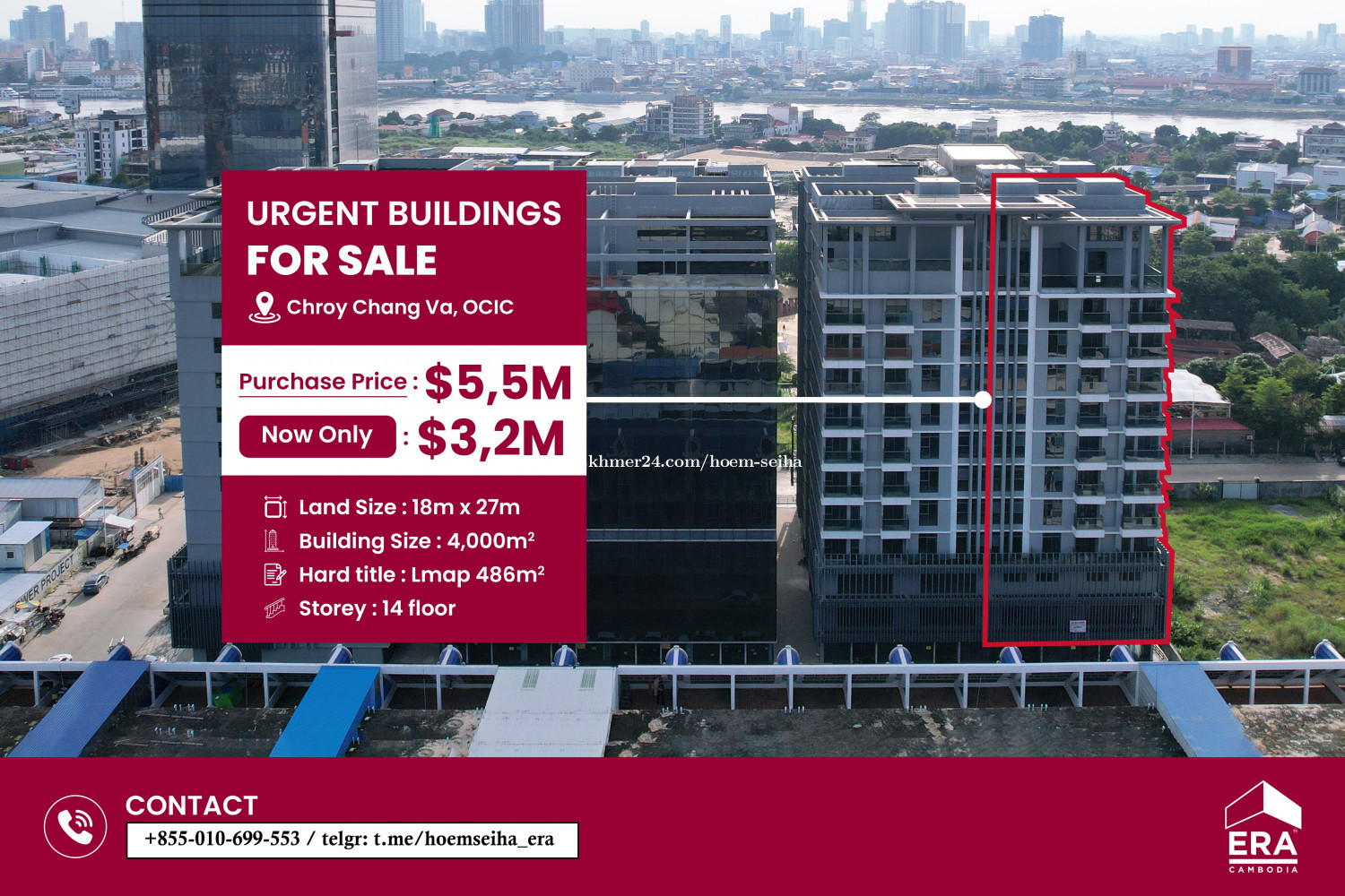 Urgent Sale – Significant Price Reduction A rare opportunity to acquire a 14-storey commercial/residential building in the fast-growing Chroy Changvar (OCIC) area, Phnom Penh, now offered at a substantially reduced price. Property Details Land Size: 18m × 27m Total Built-Up Area: approx. 4,000+ sqm Building Footprint: 16m × 20m Height: 14 floors Title: Hard Title (Free title transfer included) Pricing Original Asking Price: USD 5.5 Million Current Urgent Price: USD 3.5 Million Location Chroy Changvar – OCIC Area, Phnom Penh This property is ideal for investors, developers, serviced apartments, offices, or mixed-use conversion, offering strong upside potential at the current pricing. Serious enquiries only – Viewing by appointment Hoem Seiha | Curator of Luxe Residences – ERA Cambodia Call / WhatsApp / Telegram: +8551069xxxClick To Call3 Telegram: t.me/hoemseiha_era Email: hoe*******@eracambodia.comClick To Sent Email