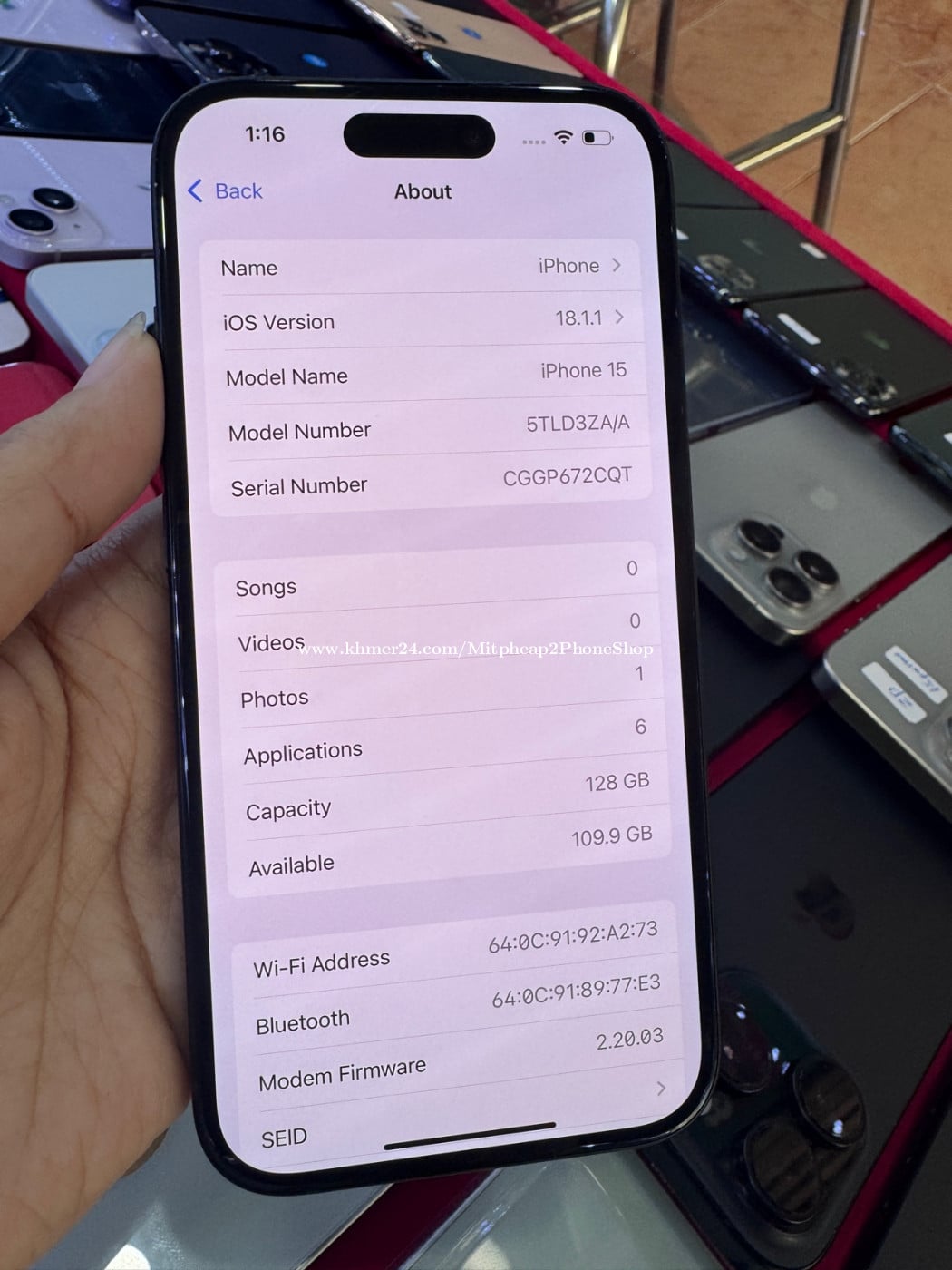 iPhone 15ថ្មីទេីបActive 128Gសុីម2
