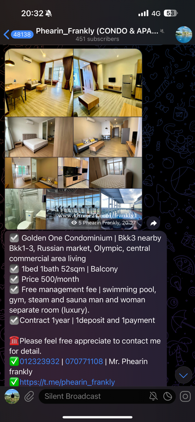 ☑️ Golden One Condominium | Bkk3 nearby Bkk1-3, Russian market, Olympic, central commercial area living ☑️ 1bed 1bath 52sqm | Balcony ☑️ Price 500/month ☑️ Free management fee | swimming pool, gym, steam and sauna man and woman separate room (luxury). ☑️Contract 1year | 1deposit and 1payment Please feel free appreciate to contact me for detail. ✅012323xxxClick To Call | 070771xxxClick To Call | Mr. Phearin frankly ✅https://t.me/Phearin_Frankly01 ➡️Check other room channel ✅ https://t.me/apartmentcondorental ✅012755xxxClick To Call | 010778xxxClick To Call | Ms. Meyly ✅https://t.me/meylycondo ➡️Check other room channel ✅https://t.me/mey_ly99999 Thanks with respectfully.