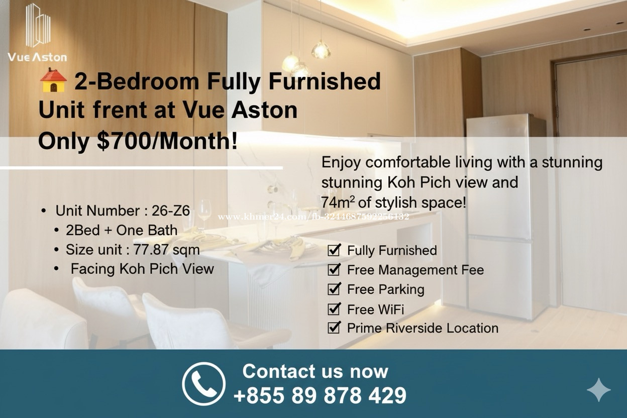 ๐ก Dream Home Alert! ๐ก Experience luxury living at Vue Aston! This stunning 2-bedroom, 1-bath, fully furnished unit (26-Z6) is available for rent at just $700/month! โจ Highlights: โข Spacious 77.87 sqm โข Breathtaking Koh Pich View! โข โ Fully Furnished โข โ FREE Management Fee โข โ FREE Parking โข โ FREE WiFi โข โ Prime Riverside Location Don't miss out on this incredible opportunity! ๐ Contact us now: +8558987xxxClick To Call9 Ask me anything Iโll reply! Vue Aston ๐ Telegram: https://t.me/Sophea_Gency
