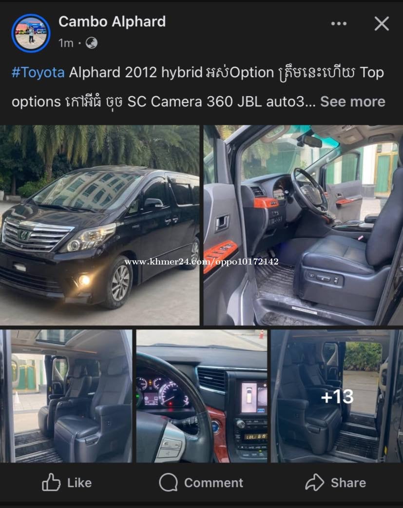 Alphard 2012 hybrid ខ្មៅក្នុងខ្មៅ ទឹកថ្នាំ សុីនមួយជុំ កៅអីធំ SC auto3 បើកដំបូល Camera 360 JBL sound 13 មុឺនKG អស់ option ត្រឹមនេះ ហើយ ( រំលស់ 25 ខេត្ត ក្រុង) Tell : 060609xxxClick To Call/098609xxxClick To Call