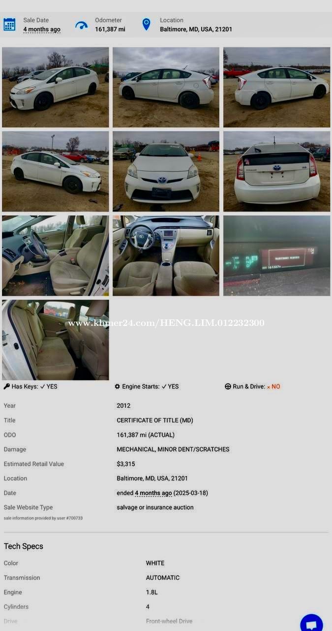2012 Prius Option 3 . ពណ៌ កាម៉ៃ / ក្នុងលឿង . ចង្កូត ស្បែក . Smart 3 . CD, Bluetooth, USB Multimedia Player , Backup Camera. . សំបុកឃ្មុំ Original . Autocheck : 83 . ម៉ាសុីន , ប្រអប់លេខ, ABS, អាគុយ HV , ម៉ូទ័របូមទឹក : ដំណើរការល្អ ✅ និងមានការធានា រយ:ពេល 30ថ្ងៃ ។ 📱 Telegram 012232xxxClick To Call