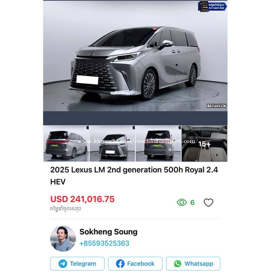 សម្រាប់កុម្ម៉ង់នាំចូល | #RA15441526 2025 Lexus LM 2nd generation 500h Royal 2.4 HEV 💵 FOB Price $129,571 💵 តម្លៃនាំចូលសរុបមួយចប់ដល់ខ្មែរ $228,331 👉ចុចមើលព័ត៏មានលម្អិត https://www.reachautoimport.com/cambodia-ra15441526-2025-lexus-lm-2nd-generation-500h-royal-24-hev-post-7477 ============== 👉Reach Auto Import សេវាជួយបញ្ជារទិញរថយន្តគ្រប់ប្រភេទពីប្រទេសកូរ៉េក្នុងតម្លៃដើម ប្រកបដោយគុណតម្លៃ សុវត្ថិភាព និងការទទួលខុសត្រូវខ្ពស់ជូនអតិថិជន 📣ចូលរួមTelegram Channel ដើម្បីទទួលបានពត៏មានតម្លៃរថយន្តល្អៗប្រចាំថ្ងៃ https://t.me/ReachAutoImportChannel">https://t.me/ReachAutoImportChannel 🌐 ចូលទៅស្វែងរករថយន្តនៅលើ Reachautoimport.com ============== ទំនាក់ទំនងមកយើងខ្ញុំ ☎️ +8558780xxxClick To Call9 ☎️ +8559280xxxClick To Call9 📩 https://t.me/ReachAutoImport Thank you!