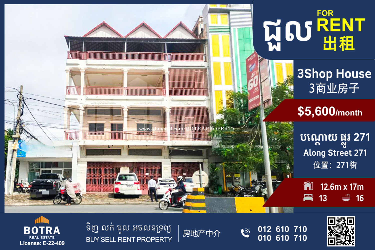 ๐ก 3-Shophouse for Rent #P1251 ๐ Location Along Street 271 - House size: 12.6m x 17m - Front: 9m | Back: 2m - Rooms: 13 | Bathrooms: 16 - Height: 3 floors - Electricity: 2-House 100Amp-3Phase - Electricity: 1-House 63Amp - Price: $5,600/month (negotiable) โโโโโโโโโ Contact us now ๐ 012610xxxClick To Call (Cellcard) ๐ 010610xxxClick To Call (Smart) โถ๏ธ t.me/BotraRealEstate (Chat)