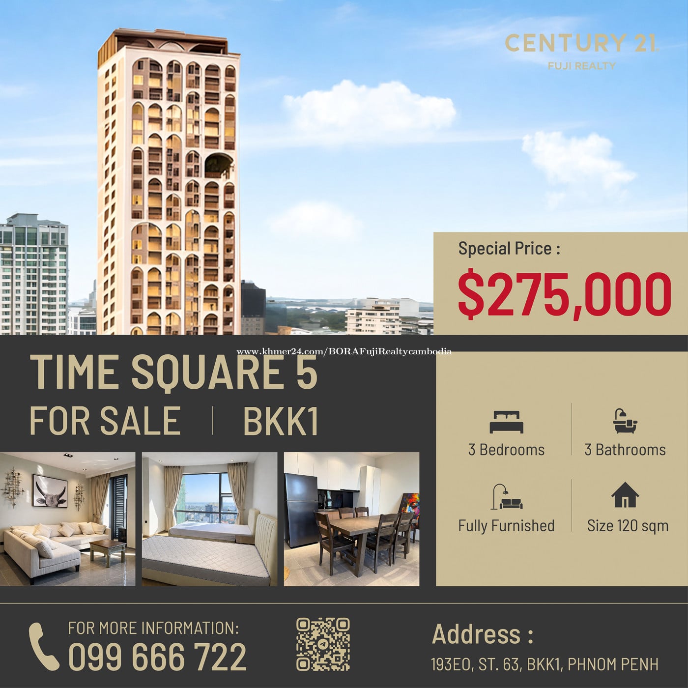 3-Bedrooms TIME SQUARE 5 for Sale! ๐ Price only $275,000 ๐ BKK1 Area โ Prime Location โ 3- Bedrooms | 3- Bathrooms โ Fully Furnished โ Total size 120 sqm โ 38th Floors, โ River View โจ Buy Now โ Move in Now! ๐ค Building Facilities: - Car Parking - Luxury Lobby & Cafรฉ - Creative Play Lounge - Infinity Sky Swimming Pool - Fitness Gym - Kidsโ Playground โโโโโโ ่ฉณ็ดฐๆ ๅ ฑใฏใๆฐ่ปฝใซใๅใๅใใใใ ใใใ ๐๐จ๐ซ๐ ๐ข๐ง๐๐จ ๐ฉ๐ฅ๐๐๐ฌ๐: ๆฅๆฌ่ชๅฏพๅฟๅฏ่ฝ ๐Tel: 099666xxxClick To Call ๐ฑDirect: https://t.me/bora_century21 ๐Join: https://t.me/resalecondo