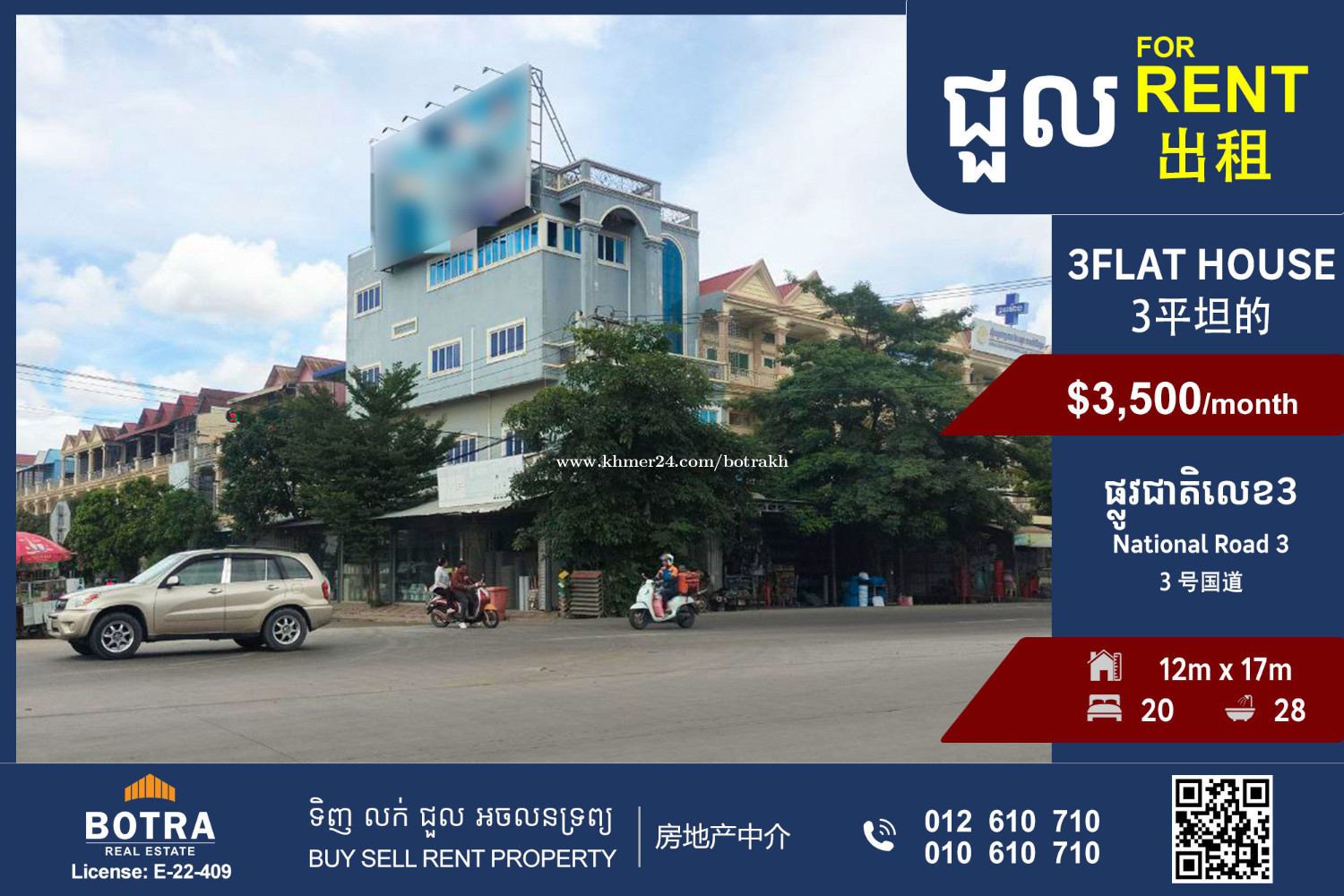๐ฃ 3Corner Flat House for Rent #P1191 ๐ Near Chaom Chao Bridge, National Road 3 - Price: $3,500/month (nego) - Size: 12m x 17m - Rooms: 20 | Bathrooms: 28 - Open Space Ground floor โโโโโโโโโ Contact us now ๐ 012610xxxClick To Call (Cellcard) ๐ 010610xxxClick To Call (Smart) โถ๏ธ t.me/BotraRealEstate (Chat)