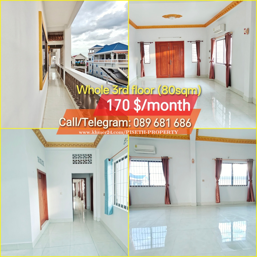 We have our 3rd floor available for lease, the space is new & spacious 80 Sqm (4.5m x 18m). The location is in an uncrowded area with close access to MC Park, Midtown Mall, & CCC Sports Center. Please have below information: . Lease cost: 170$/month . Parking: available at the Ground floor . Electricity: 0.25 $/kWh . Water: 0.5 $/m3 . Items comprised: Air Con, new mattress, restroom accessories. Other items could be arranged upon discussion. Please contact us by: 089681xxxClick To Call
