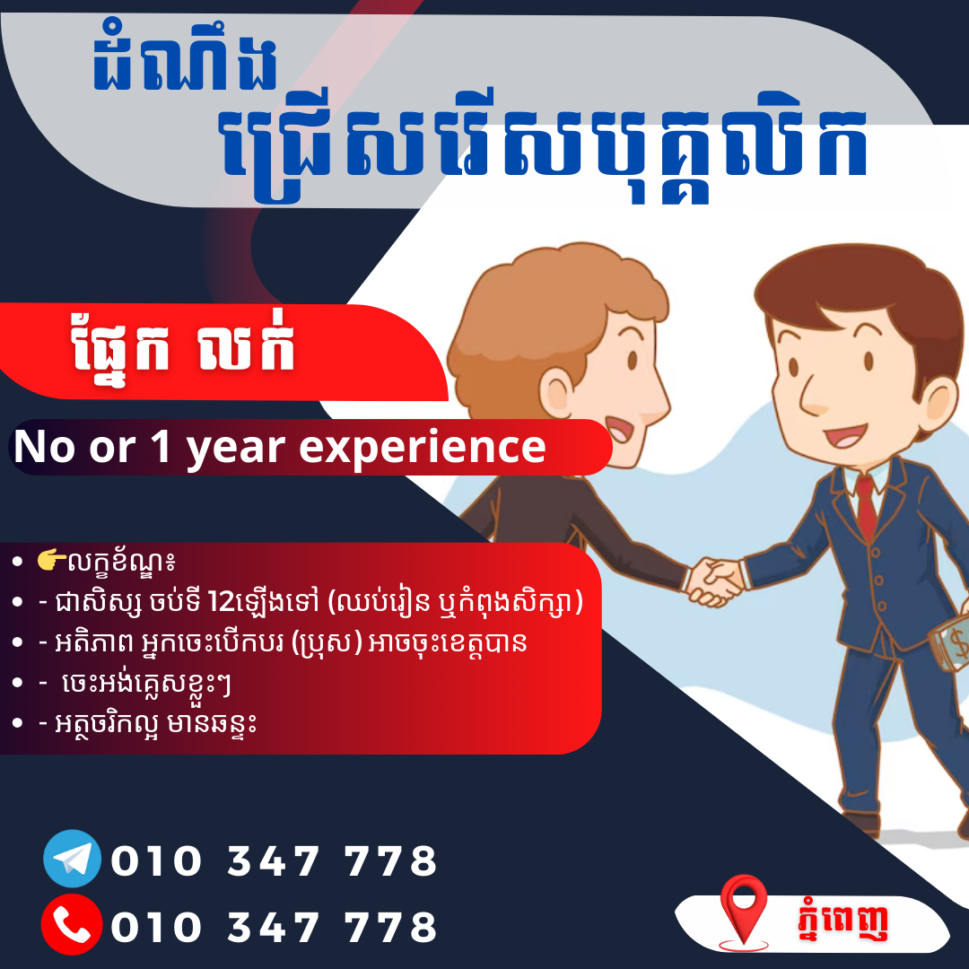 ផ្នែកលក់ (Sale Outdoor)ផ្នែកលក់ (Sale Outdoor)Just now • Saensokh, Phnom PenhFull-time • 1Year+ Experience$300+
