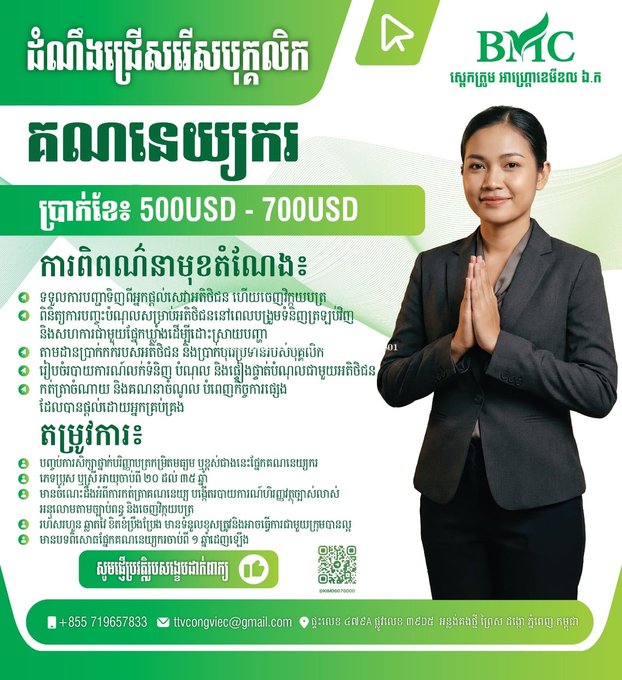 ការពិពណ៌នាមុខតំណែង៖ ទទួលការបញ្ជាទិញពីអ្នកផ្តល់សេវាអតិថិជន ហើយចេញវិក្កយបត្រ ពិនិត្យការបញ្ចុះបំណុលសម្រាប់អតិថិជននៅពេលបង្រួមទំនិញត្រឡប់វិញ និងសហការជាមួយផ្នែកឃ្លាំងដើម្បីដោះស្រាយបញ្ហា តាមដានប្រាក់កក់របស់អតិថិជន និងប្រាក់បុរេប្រទានរបស់បុគ្គលិក រៀបចំរបាយការណ៍លក់ទំនិញ បំណុល និងផ្ទៀងផ្ទាត់បំណុលជាមួយអតិថិជន កត់ត្រាចំណាយ និងគណនាចំណូល បំពេញកិច្ចការផ្សេង ដែលបានផ្ដល់ដោយអ្នកគ្រប់គ្រង តម្រូវការ៖ បញ្ចប់ការសិក្សាថ្នាក់បរិញ្ញាបត្រកម្រិតមធ្យម ឬខ្ពស់ជាងនេះផ្នែកគណនេយ្យករ ភេទប្រុស ឬស្រី អាយុចាប់ពី ២០ ដល់ ៣៥ ឆ្នាំ មានចំណេះដឹងអំពីការកត់ត្រាគណនេយ្យ បង្កើតរបាយការណ៍ហិរញ្ញវត្ថុច្បាស់លាស់ អនុលោមតាមច្បាប់ពន្ធ និងចេញវិក្កយបត្រ រហ័សរហួន ឆ្លាតវៃ ខិតខំប្រឹងប្រែង មានទំនួលខុសត្រូវនិងអាចធ្វើការជាមួយក្រុមបានល្អ មានបទពិសោធផ្នែកគណនេយ្យករចាប់ពី ១ ឆ្នាំដេញឡើង