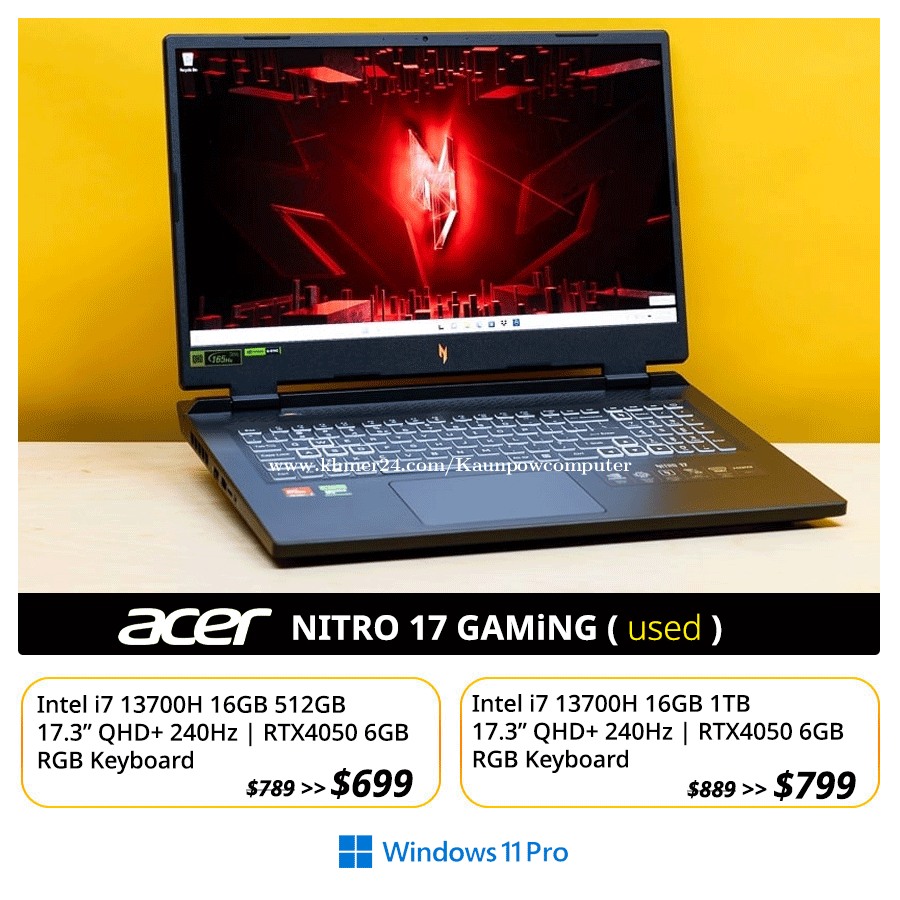 ๐ Nitro 17 Gaming / RTX4050 (used) ๐ฏ ============================== Intel Core i7-13700H 16GB 512GB 17.3" QHD+ 240Hz RTX 4050 6GB | RGB Keyboard ------------------------------------- โ๏ธ แแแถแแแแแแ 0950937xxxClick To Call 77 ๐ฌ Telegram : t.me/cnkcomputer93 ๐ Website: https://cnkcomputer.com