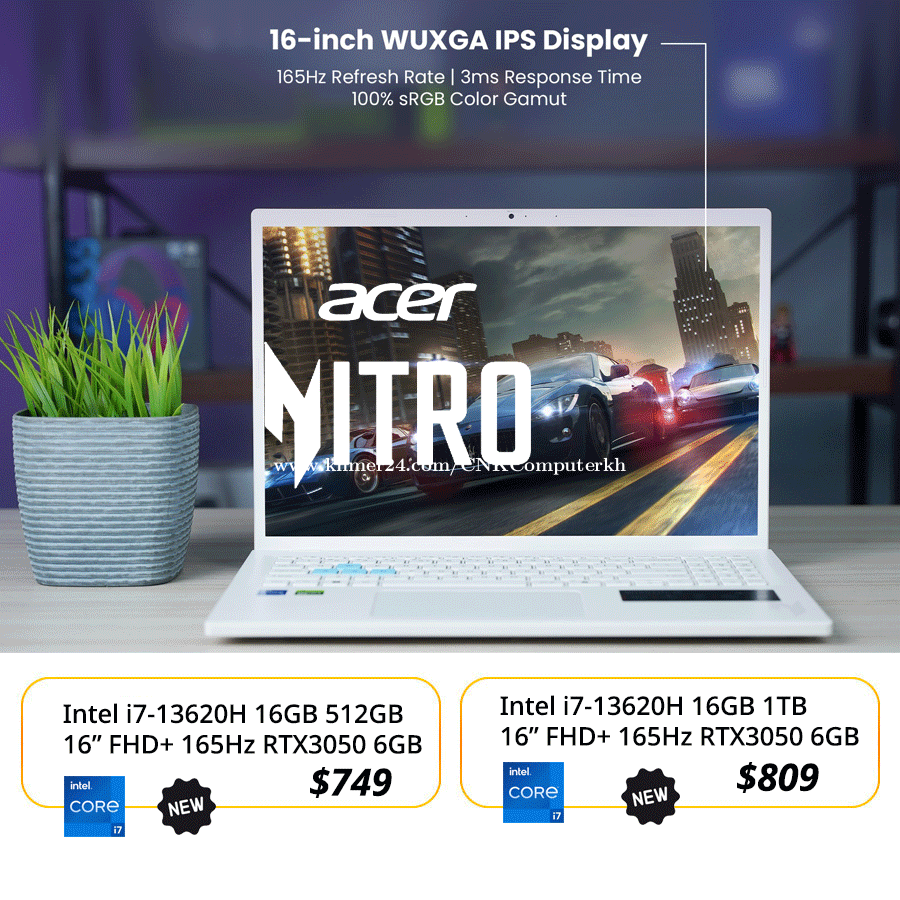 Acer Nitro Lite 16 White Edition $749 --------------------------------------- - CPU : 13th Gen Intel i7-13620H Processor - RAM : 16GB DDR5 - Storage : 512GB M.2 PCIe - Display : 16" WQXGA IPS 165Hz - GPU : NVIDIA RTX 3050 6GB - Windows 11 Pro Recommendation - Backlit Keyboard - Weight : 1.8Kg | Color : White ☎️ ទនាក់ទំនង 0930957xxxClick To Call 77 💬 Telegram : t.me/cnkcomputer93 🌐 Website: https://cnkcomputer.com/