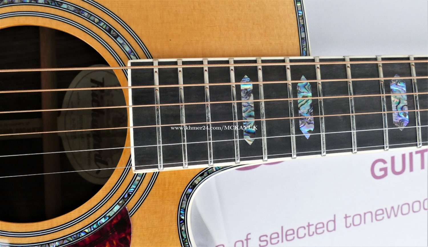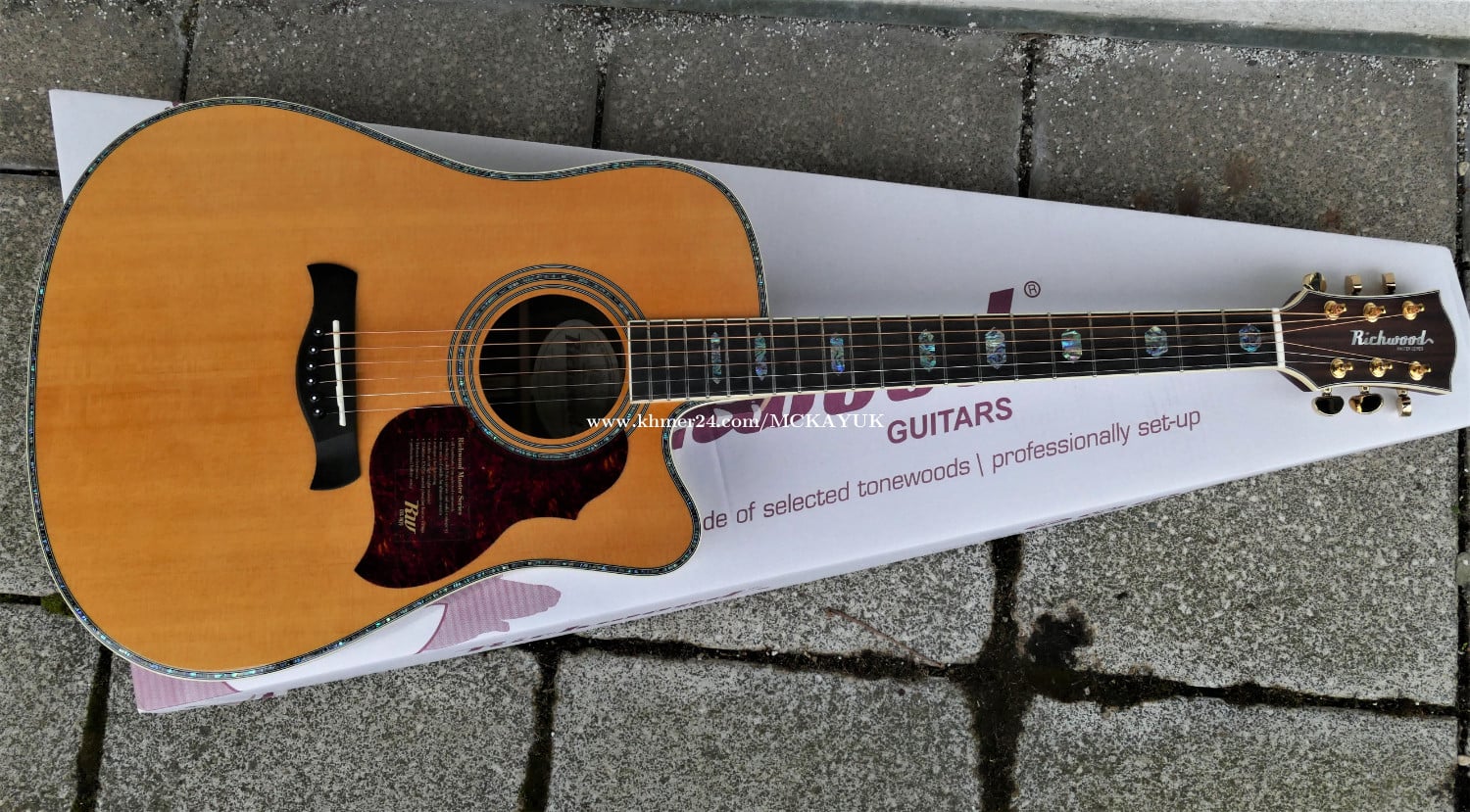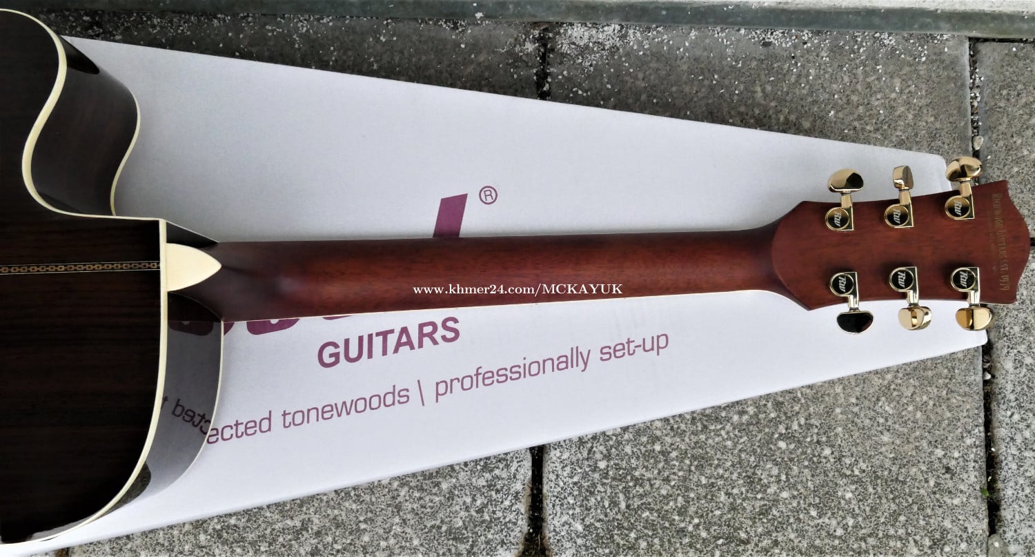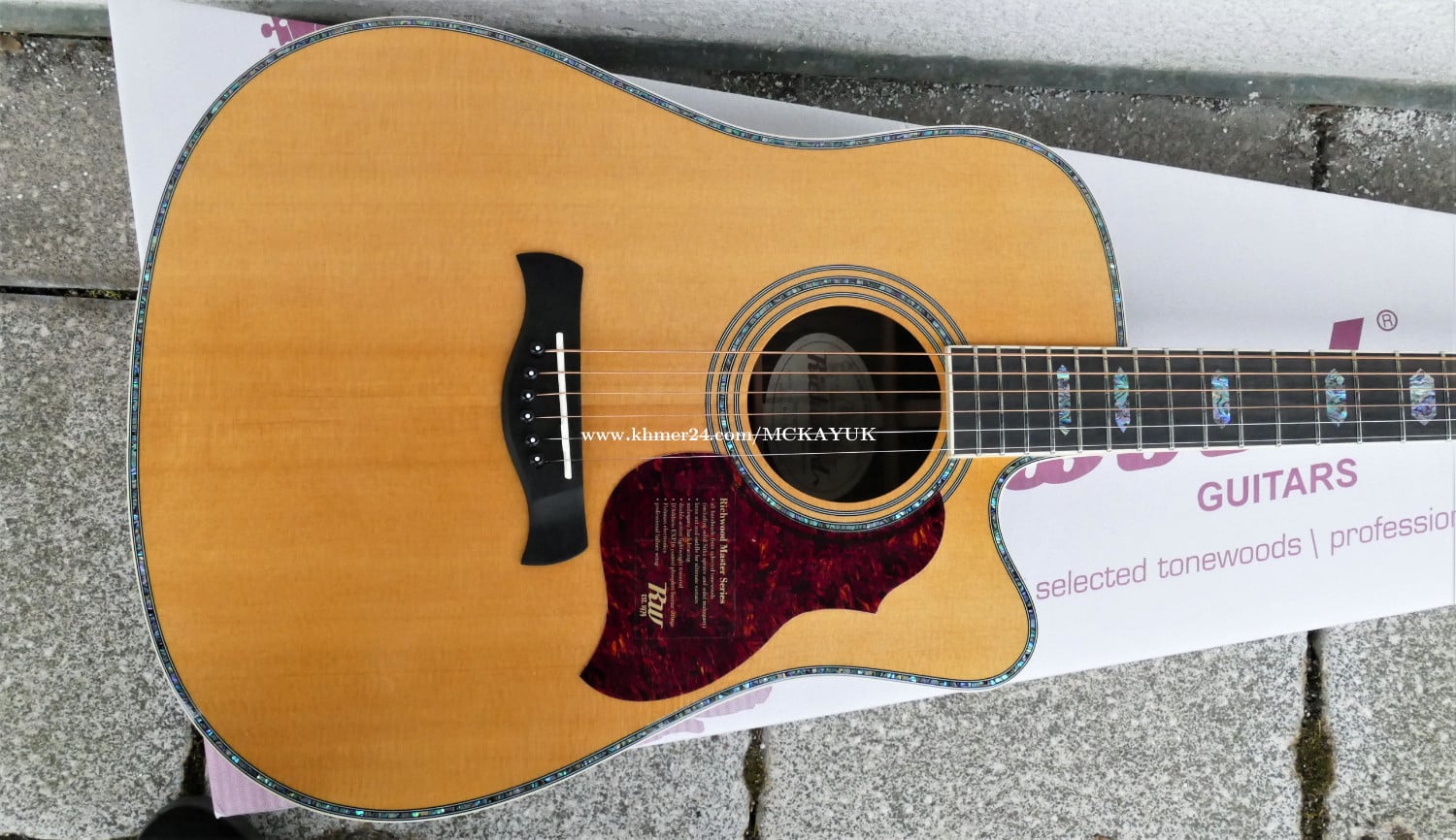 Premium Acoustic Guitar Imported from Germany 15th Feb. 2024 Excellent Condition body shape: dreadnought cutaway bracing design: X scalloped, with mahogany back braces scale length: 650 mm nut width: 43,6 mm body length: 500 mm top material: solid AA grade Sitka spruce back & side material: laminated rosewood neck material: Indonesian mahogany fingerboard material: ebony fingerboard binding material: ivoroid ABS fingerboard radius: 14" bridge material: ebony top colour: vintage aged body finishing: glossy neck finish: satin rosette: 3 rings model with real abalone top purfling: real abalone side binding: ivory ABS back binding: ivory ABS truss rod: active two-way nut & saddle material: bone 43*6 mm and 72*3 mm machine head: Derjung Deluxe gold pickguard: tortoise Pick Up System: Fishman Presys+