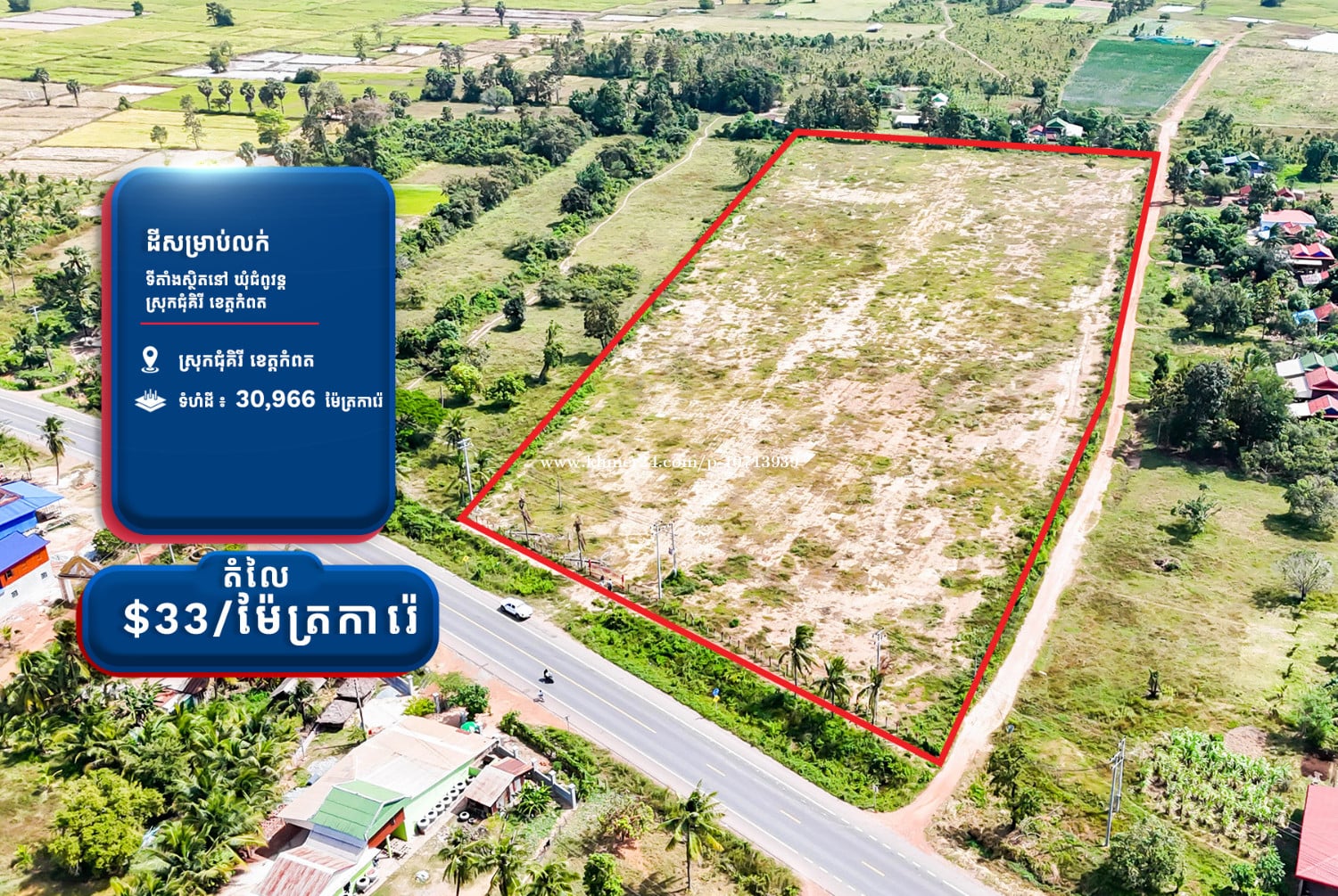 Prime Affordable Industrial Land for Sale on National Road 41 Location: Champouwan Chumkiri, Kampot Province (National Road 41, KM 76) Size: 30,966 sqm (over 3 hectares) – Wide road frontage for heavy vehicles Title: Hard Title (secure, bank-financeable, hassle-free transfer) Ideal for: Factory, warehouse, agro-processing plant, logistics hub, or storage facility Price: Only US$33/sqm (Negotiable) – Exceptional value in 2025 market Why This Land Special: Strategic position on National Road 41, a growing corridor connecting Phnom Penh to Kampot and southern coastal areas. Affordable entry into Cambodia’s expanding industrial and agro sectors – perfect for manufacturing, food processing, or distribution businesses. Large, flat, and ready-to-build plot with excellent accessibility and room for expansion. At just $33/sqm, this is one of the most competitive prices for hard-title land along a major national road – strong potential for quick appreciation as infrastructure improves. Motivated seller looking for a fast deal. Ideal for investors or businesses seeking high-return land in a rising province. Contact now to discuss terms and arrange a site visit! ដីលក់តម្លៃថោកដ៏ល្អនៅផ្លូវជាតិលេខ ៤១ • ទីតាំង៖ ចំពូវ័ន ជុំគិរី ខេត្តកំពត (ផ្លូវជាតិលេខ ៤១ គីឡូម៉ែត្រ ៧៦) • ទំហំ៖ ៣០,៩៦៦ ម៉ែត្រការ៉េ (ជាង ៣ ហិកតា) – មុខផ្លូវធំទូលាយ ងាយស្រួលសម្រាប់រថយន្តធំ • ប្លង់៖ ប្លង់រឹង (សុវត្ថិភាពខ្ពស់ ខ្ចីធនាគារបាន ផ្ទេរងាយ) • ស័ក្តិសមសម្រាប់៖ រោងចក្រ ឃ្លាំង រោងចក្រកែច្នៃកសិផល មជ្ឈមណ្ឌលដឹកជញ្ជូន ឬស្តុកទំនិញ • តម្លៃ៖ ត្រឹម ៣៣ ដុល្លារ/ម៉ែត្រការ៉េ (ចរចាបាន) – តម្លៃពិសេសក្នុងទីផ្សារ ២០២៥ ចំណុចលេចធ្លោ • ទីតាំងយុទ្ធសាស្ត្រនៅជាប់ ផ្លូវជាតិលេខ ៤១ ដែលកំពុងអភិវឌ្ឍខ្លាំង ភ្ជាប់ភ្នំពេញទៅកំពត និងតំបន់ឆ្នេរខាងត្បូង • តម្លៃចូលវិនិយោគទាប ស័ក្តិសមបំផុតសម្រាប់អាជីវកម្មផ្នែកឧស្សាហកម្ម កែច្នៃកសិផល ឬដឹកជញ្ជូន • ដីរាបស្មើធំទូលាយ រួចរាល់សាងសង់ភ្លាមៗ មានកន្លែងពង្រីកច្រើន • តម្លៃត្រឹម ៣៣ ដុល្លារ/ម៉ែត្រការ៉េ គឺជាឱកាសកម្រសម្រាប់ដីប្លង់រឹងតាមផ្លូវជាតិ – សក្តានុពលតម្លៃកើនខ្ពស់ឆាប់ៗ ម្ចាស់ចង់លក់លឿន ស្វាគមន៍ចរចាតម្លៃ។ ស័ក្តិសមសម្រាប់វិនិយោគិន ឬអាជីវករដែលស្វែងរកដីមានតម្លៃកើនខ្ពស់នៅខេត្តកំពុងរីកចម្រើន។ ទាក់ទងឥឡូវដើម្បីមើលដីនិងពិភាក្សា!