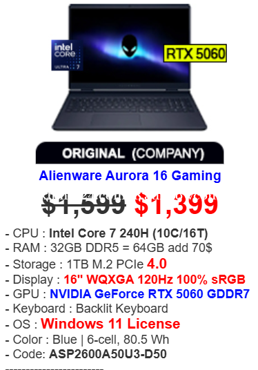 Alienware Aurora 16 Gaming - CPU : Intel Core 7 240H (10C/16T) - RAM : 32GB DDR5 = 64GB add 70$ - Storage : 1TB M.2 PCIe 4.0 - Display : 16" WQXGA 120Hz 100% sRGB - GPU : NVIDIA GeForce RTX 5060 GDDR7 - Keyboard : Backlit Keyboard - OS : Windows 11 License - Color : Blue | 6-cell, 80.5 Wh - Code: ASP2600A50U3-D50
