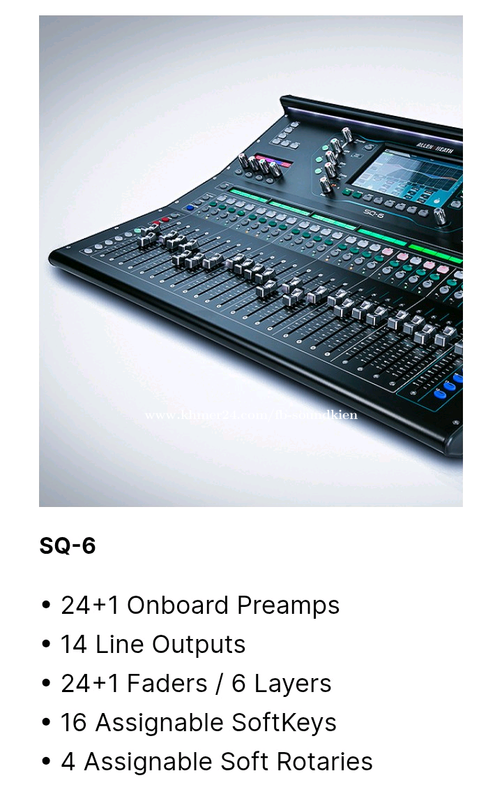 Audio and Processing: 96kHz XCVI FPGA processing 48 input channels 12 stereo mixes + LR 3 stereo matrix 8 stereo FX engines + dedicated stereo returns DEEP processing ready Onboard I/O: 24+1 built-in mic preamps 2 stereo line inputs 14 XLR line outputs 2 TRS line outputs AES output Control: 24+1 Faders / 6 Layers 7” capacitive touchscreen 16 assignable SoftKeys 4 assignable Soft Rotaries SQ-MixPad app SQ4You app Expandability and Integration: SLink port for remote audio / expansion 64×64 I/O port for audio networking cards (Dante, Waves, MADI, SLink) Recording and Streaming: SQ-Drive direct recording to USB 32×32 96kHz USB interface