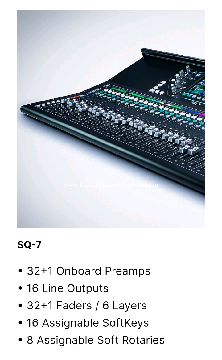 Audio and Processing: 96kHz XCVI FPGA processing 48 input channels 12 stereo mixes + LR 3 stereo matrix 8 stereo FX engines + dedicated stereo returns DEEP processing ready Onboard I/O: 32+1 built-in mic preamps 2 stereo line inputs 16 XLR line outputs 2 TRS line outputs AES output Control: 32+1 Faders / 6 Layers 7” capacitive touchscreen 16 assignable SoftKeys 8 assignable Soft Rotaries SQ-MixPad app SQ4You app Expandability and Integration: SLink port for remote audio / expansion 64×64 I/O port for audio networking cards (Dante, Waves, MADI, SLink) Recording and Streaming: SQ-Drive direct recording to USB 32×32 96kHz USB interface