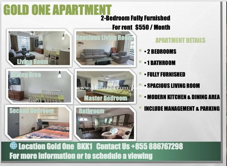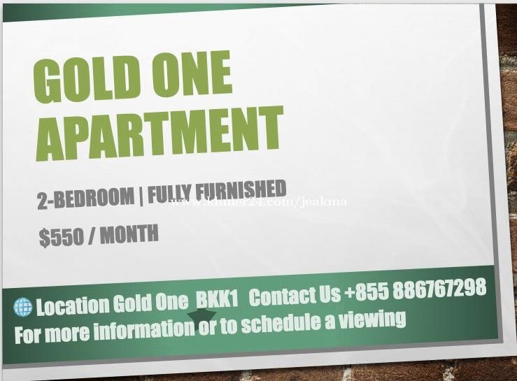 GOLD ONE APARTMENT 2-Bedroom Fully Furnished For rent $550 / Month APARTMENT DETAILS • 2 BEDROOMS • 1 BATHROOM • FULLY FURNISHED • SPACIOUS LIVING ROOM • MODERN KITCHEN & DINING AREA •INCLUDE MANAGEMENT Wifi & PARKING © Location Gold One BMK1 Contact Us +855886767xxxClick To Call For more information or to schedule a viewing