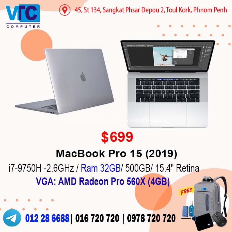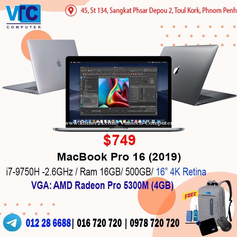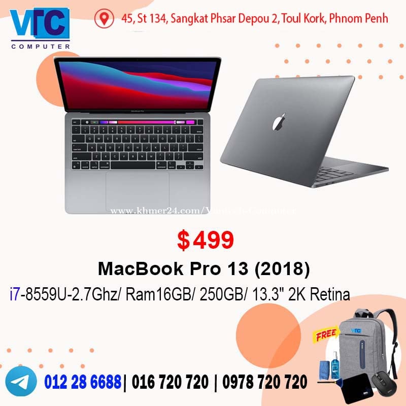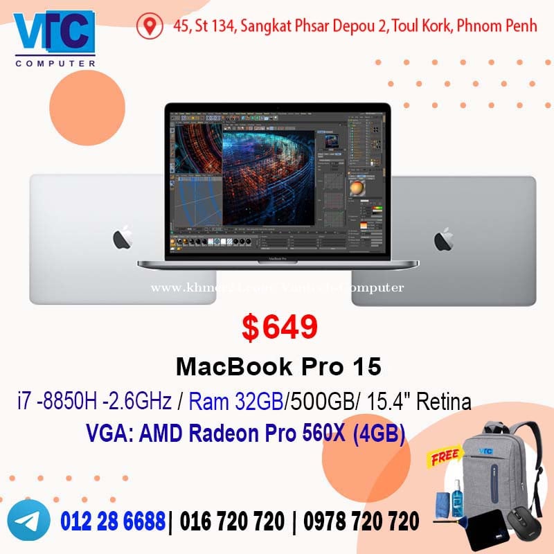 - Apple MacBook Pro 13 (2018) . $499 i7- 8559U/ Memory 16GB / 256GB SSD / 13.3" 2K Retina / Color: Space Gray / Touch Bar -Apple MacBook Pro 15 (2018) VGA . $549 i7-8750H-2.2GHz/ Ram 16GB/ 250GB / 15.4" Retina / Radeon Pro 555X (4GB)/ Silver+Gray / Touch Bar - Apple MacBook Pro 15 (2018 ) VGA . $599 i7-8750H -2.2GHz / Ram 32GB/ 250GB SSD/ 15.4" Retina / Pro 555X (4GB) / Silver/ Touch Bar - Apple MacBook Pro 15 (2018 ) VGA . $649 i7-8850H -2.6GHz/ Ram 32GB/ 500GB SSD/ 15.4" Retina / Pro 560X (4GB)/ Silver / Touch Bar - Apple MacBook Pro 15 (2019) VGA . $569 i7 - 9750H -2.6GHz/ RAM 16GB / 250GB / 15.4" Retina/ AMD Radeon Pro 555X (4GB)/ Silver/ Touch Bar - Apple MacBook Pro 15 (2019) VGA . $699 i7 - 9750H -2.6GHz/ RAM 32GB / 500GB SSD/ 15.4" Retina/ Radeon Pro 560X (4GB)/ Silver/ Touch Bar - Apple MacBook Pro 16 (2019) VGA . $749 i7-9750H- 2.6GHz/ Memory 16GB/ 500GB /16” 4K Retina/ Radeon Pro 5300M (4GB)/ Silver & Space Gray/ Touch Bar - Apple Watch Series 4 (GPS + Cellular + 40mm) / Color : Black Aluminum Case. $75 - Apple Watch Series 4 (GPS + Cellular + 44mm) / Color : White + Black Aluminum Case. $85 - Apple Watch Series 5 (GPS + Cellular + 44mm + 32GB) / Color : White + Black Aluminum Case. $129 VANTECH COMPUTERS Telegram : 012286xxxClick To Call (Cell Card)/ 016720xxxClick To Call (Smart )/ 0978720xxxClick To Call (Metfone) Telegram : https://t.me/+AEgivSId2VYyMmE1 Address : 45, St 134, Sangkat Phsar Depou 2, Toul Kork, Phnom Penh, Cambodia (near Stop DN) Location : https://maps.app.goo.gl/jxuEHF5QDEF1Fbvh8?g_st=it Website: www.vtccomputers.com