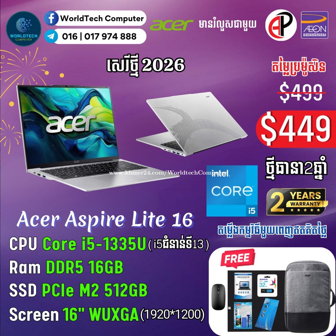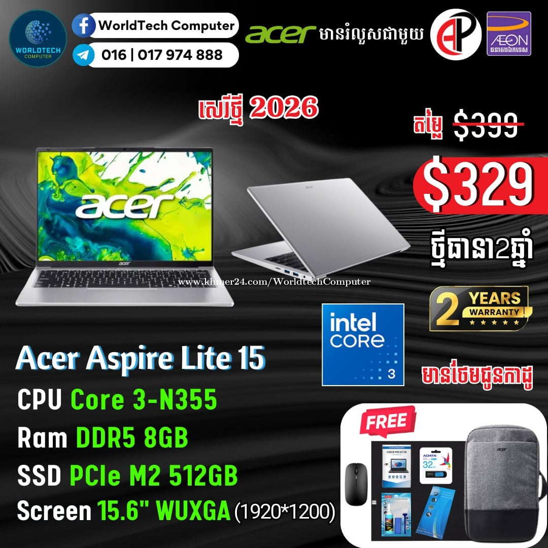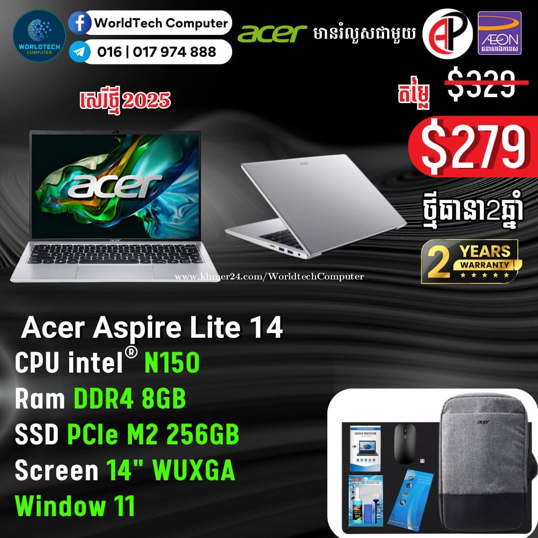ថ្មីកេស ធានា២ឆ្នាំ Aspire lite14 N150 RAM 8G M2 512G 14" WUXGA New=299$ Aspire lite14 N150 RAM 8G M2 256G 14" WUXGA New=279$ រាងស្អាត ស្តើងស្រាល Telegram 017974xxxClick To Call , 011777xxxClick To Call