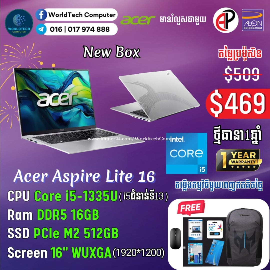 Acer aspire lite 16 New ថ្មីកេស ធានា1ឆ្នាំពីAcer Cambodia Aspire Lite14 N150 RAM DDR5 8G M2 256G 14" IPS WUXGA(1920*1200) New=299$ Aspire Lite14 N150 RAM DDR5 8G M2 512G 14" IPS WUXGA(1920*1200) New=329$ Core 3-N355 RAM DDR5 8G M2 512GB IPS 15.6" WUXGA(1920*1200) New=349$ Core i3-1315U RAM DDR5 8G M2 512GB IPS 16" WUXGA(1920*1200) New=349$ Core i5-1335U RAM DDR5 16G M2 512GB IPS 16" WUXGA(1920*1200) New=469$ New Warranty 1Year From Acer Cambodia Telegram: 017974xxxClick To Call , 011777xxxClick To Call ទីតាំងហាង: ផ្ទះ39Eo ផ្លូវ257 ទឹកល្អក់3 ទួលគោក ភ្នំពេញ (ខាងលិចស្តុបទេពផនប្រហែល 300ម)។ Location: #39E0 St257, Tuol Kouk , Tuek L'ak Bei , Phnom Penh