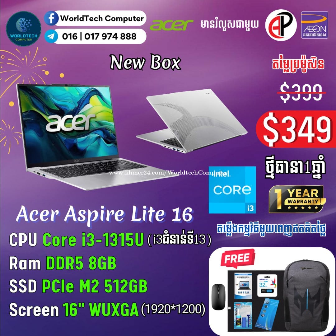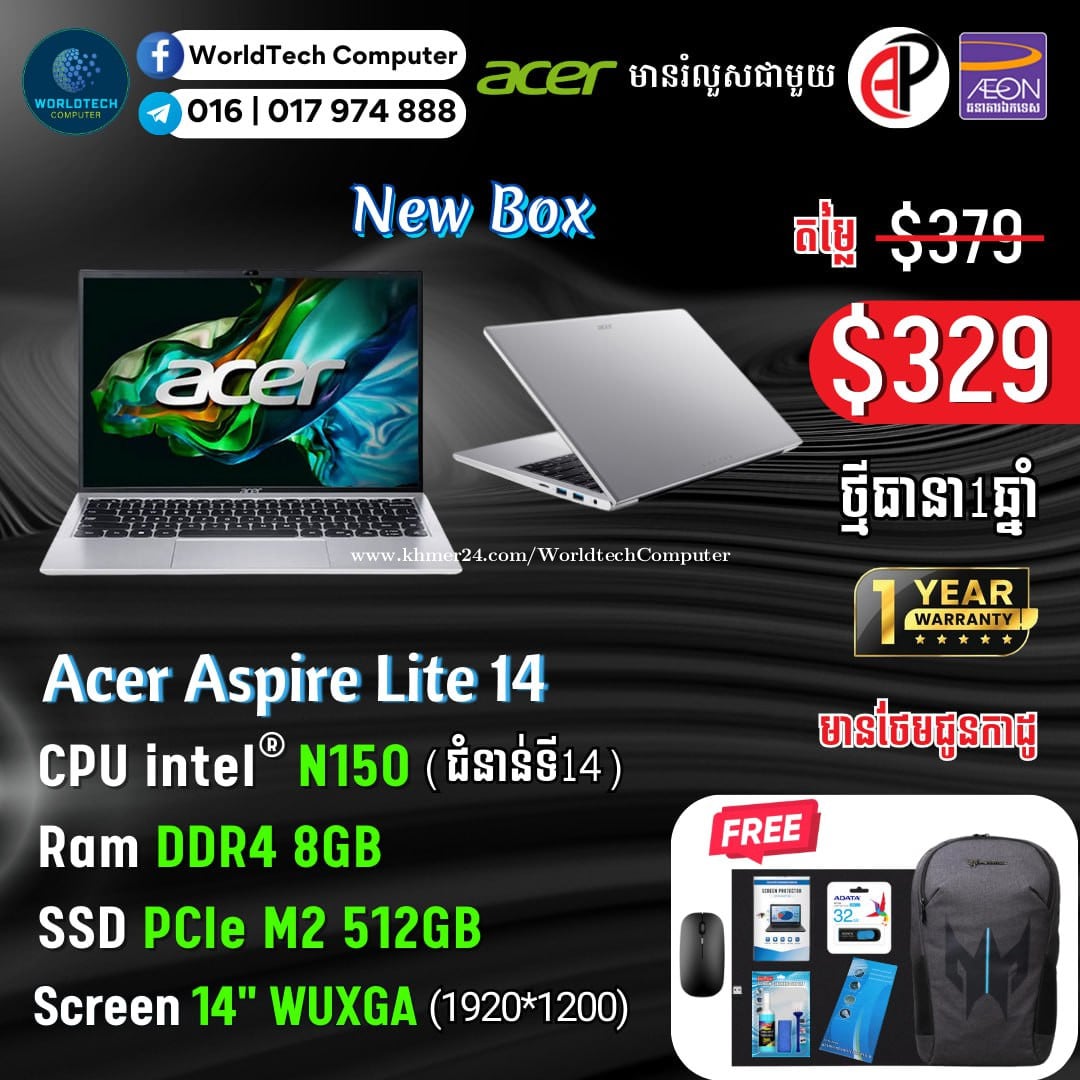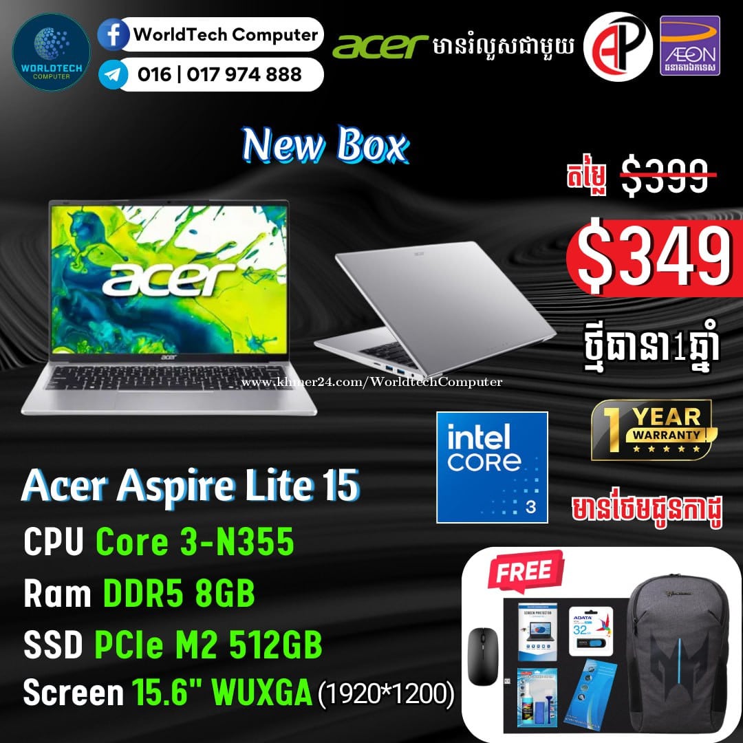 Acer aspire lite 16 New ថ្មីកេស ធានា1ឆ្នាំពីAcer Cambodia Aspire Lite14 N150 RAM DDR5 8G M2 256G 14" IPS WUXGA(1920*1200) New=299$ Aspire Lite14 N150 RAM DDR5 8G M2 512G 14" IPS WUXGA(1920*1200) New=329$ Core 3-N355 RAM DDR5 8G M2 512GB IPS 15.6" WUXGA(1920*1200) New=349$ Core i3-1315U RAM DDR5 8G M2 512GB IPS 16" WUXGA(1920*1200) New=349$ Core i5-1335U RAM DDR5 16G M2 512GB IPS 16" WUXGA(1920*1200) New=479$ New Warranty 1Year From Acer Cambodia Telegram: 017974xxxClick To Call , 011777xxxClick To Call ទីតាំងហាង: ផ្ទះ39Eo ផ្លូវ257 ទឹកល្អក់3 ទួលគោក ភ្នំពេញ (ខាងលិចស្តុបទេពផនប្រហែល 300ម)។ Location: #39E0 St257, Tuol Kouk , Tuek L'ak Bei , Phnom Penh