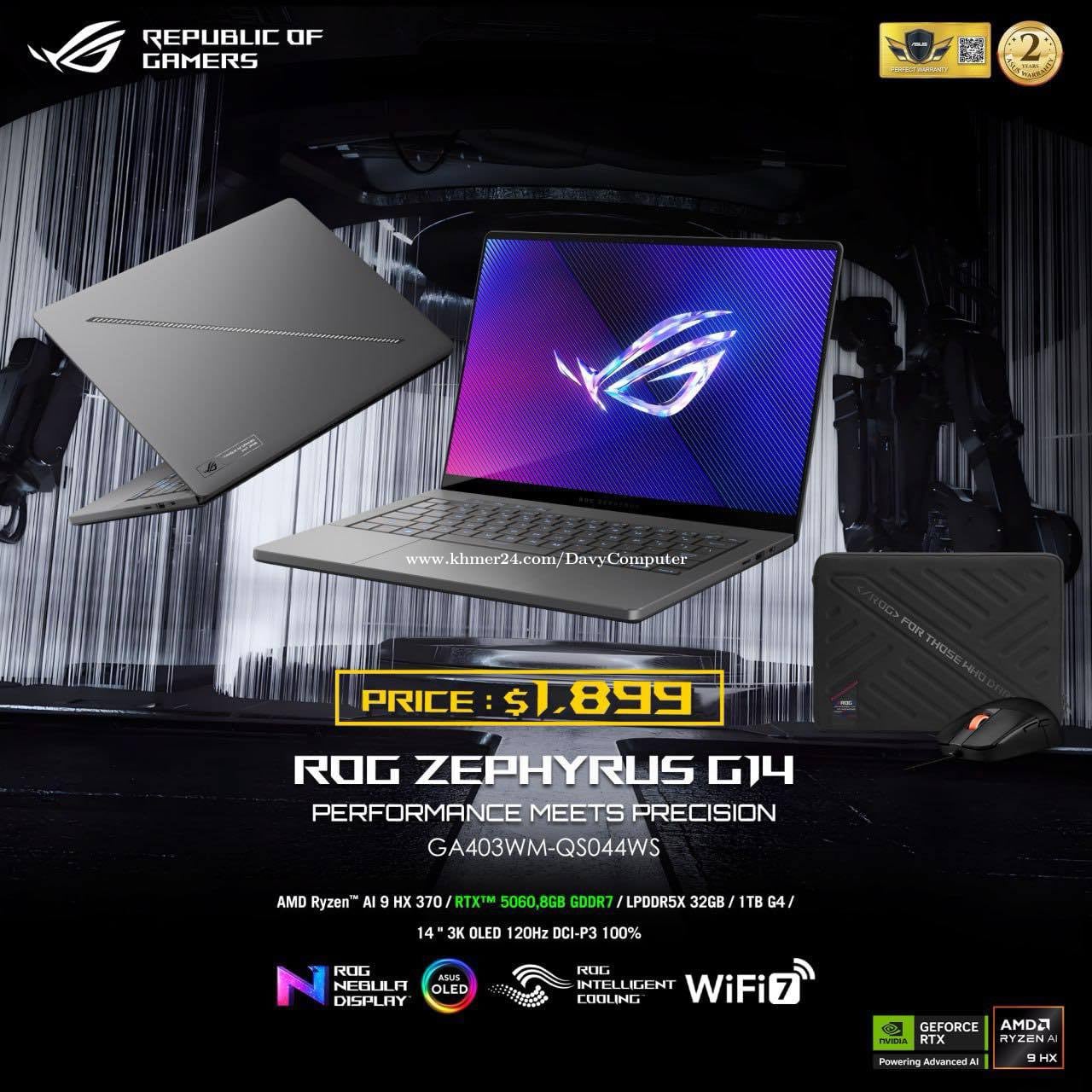 ASUS ROG Promotion ASUS GA403WM-QS044WS-Eclipse GrayAMD Ryzen™ AI 9 HX 370 / RTX™ 5060,8GB GDDR7 / 14 " 3K (2880 x 1800) OLED 120Hz OLED DCI-P3 100% / LPDDR5X 32GB / 1TB G4 / Backlit Chiclet Keyboard 1-Zone RGB With Copilot key / ROG Impact Gaming Mouse, ROG Zephyrus G14 Sleeve (2024) / Win11 / 2Y Warranty+1st Year Local Perfect Warranty