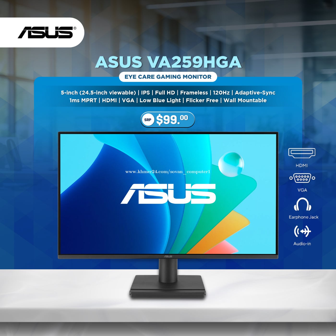 រូបភាពច្បាស់ត្រជាក់ភ្នែក ការពារភ្នែ្កក ទោះមើលយូរប៉ុណ្ណាក៏គ្មានបញ្ហា👁 សូមណែនាំ ASUS EYE CARE Professional Monitor VA259HGA ដែលមានទំហំអេក្រង់25-Inch កម្រិតរូបភាពភ្លឺច្បាស់ល្អ Full HD ត្រជាក់ភ្នែក 99% sRGB, 120Hz. សាកសមសម្រាប់អោយលោកអ្នកប្រើប្រាស់ប្រចាំថ្ងៃ, ការDesign កាត់តវីដេអូ និងការលេងហ្គេមបានយ៉ាងស្រួល👍 ------------------ សម្រាប់ព័ត៌មានបន្ថែមសូមទំនាក់ទំនងមកយើងខ្ញុំ ☎️012463xxxClick To Call / 093317xxxClick To Call 📡Telegram : https://t.me/sovancomputer 🌏www.sovancomputer.com 🫰Tik Tok : www.tiktok.com/@sovancomputer 🧚♂️Khmer24 : https://www.khmer24.com/sovan_computer1 ▶️Youtube Channel : https://www.youtube.com/@sovancomputer2958/videos 🗺ផែនទីហាងយើងខ្ញុំ https://goo.gl/maps/6oMaL4vCWuufnt83A 🏠អាស័យដ្ធាន Address : ផ្ទះលេខ ១៨B ផ្លូវ៣៣៦ សង្កាត់វាលវង់ ខណ្ឌ៧មករា រាជធានីភ្នំពេញ (ខាងក្រោយវត្តព្រះពុទ្ធមានបុណ្យ)