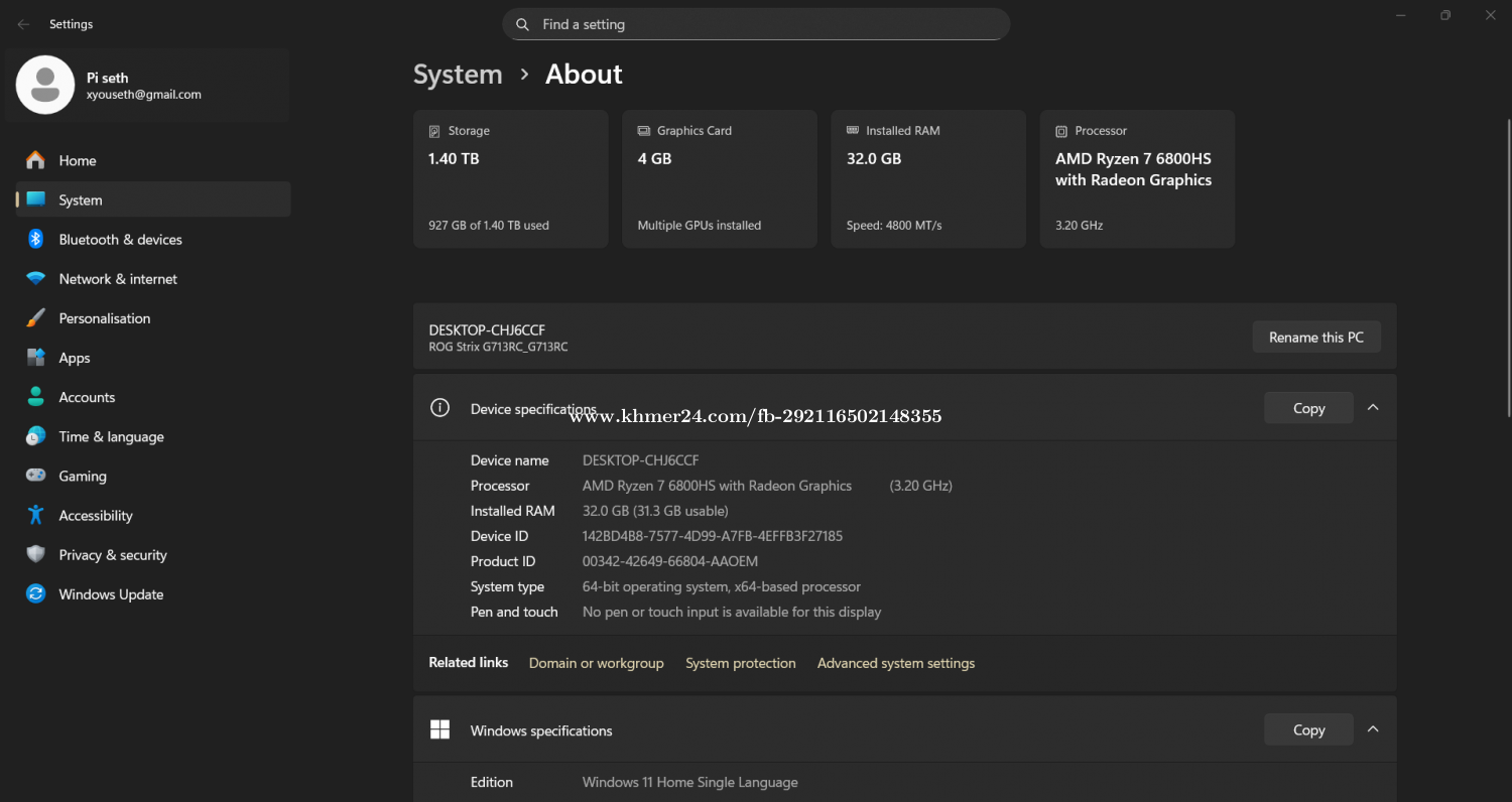 Asus Rog G713RC តំលៃល្អ 600 សំរាប់ការងារឌីសាញប្លង់ កាត់តវិដេអូ និងលេងហ្គេម ធំៗ ======================== ASUS ROG Strix G713RC 17.3”FHD 144Hz ➡️ CPU : AMD Ryzen 7 6800H(16CPUs)3.2GHz ➡️ RAM : 32GB ➡️ SSD : M2. 512GB( Fast Speed ) + HDD 1T ➡️ VGA: NVIDIA RTX 3050 4GB GDDR6 ➡️ Keyboard Light RGB