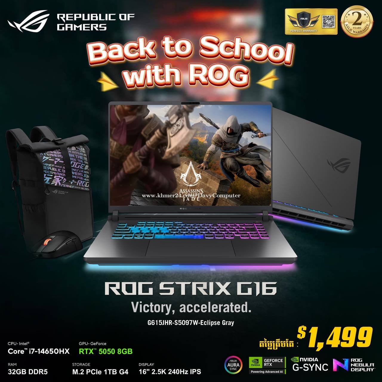 ASUS ROG Model 2025 G615JHR-S5097W-Eclipse Gray Intel® Core™ i7 14650HX / RTX™ 5050,8GB GDDR7 / 16 " 2.5K (2560 x 1600, WQXGA) 240Hz IPS-level DCI-P3 100% / DDR5 32GB / 1TB G4 / Backlit Chiclet Keyboard 4-Zone RGB With Copilot key / ROG Impact Gaming Mouse ,ROG backpack / Win11 / 2Y Warranty+1st Year Local Perfect Warranty
