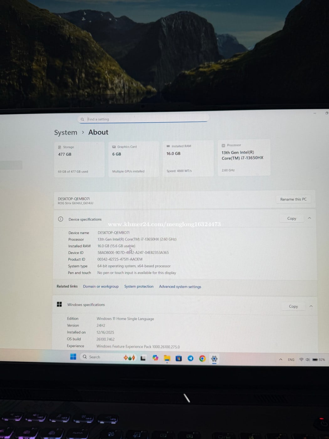 CPC : Core(TM) i7-13650HX 2.60GHz Ram :16GB VGA : NVIDIA GeForce RTX 4050 6GB SSD : 512GB
