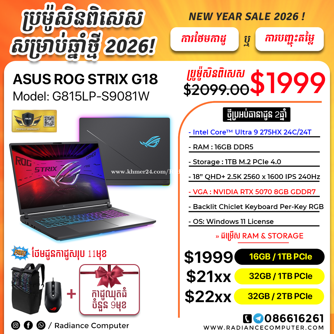 មានលក់នៅរេឌានកុំព្យូទ័រ រាល់ការជាវ Laptop និងទទួលបាន ការតម្លើង Software+ Game ឥតគិតថ្លៃ Lifetime ================== ☎️𝐂𝐚𝐥𝐥 𝐍𝐨𝐰: 086616xxxClick To Call- 011616xxxClick To Call 👉𝐖𝐨𝐤𝐢𝐧𝐠 𝐓𝐢𝐦𝐞: 8:00am - 6:30pm (Mon-Sun) 👉𝐓𝐢𝐤𝐓𝐨𝐤: https://www.tiktok.com/@radiancecomputer 🌐𝐖𝐞𝐛𝐬𝐢𝐭𝐞: https://www.radiancecomputer.com/#promotion 💬𝐓𝐞𝐥𝐞𝐠𝐫𝐚𝐦: 086616xxxClick To Call https://t.me/radiancecomputerkh 👉𝐓𝐞𝐥𝐞𝐠𝐫𝐚𝐦 𝐂𝐡𝐚𝐧𝐧𝐞𝐥: https://t.me/radiancesale 🗺ទីតាំង: ក្រោយវិទ្យាល័យជាស៊ីមសាមគ្គី 🗺Map : https://maps.app.goo.gl/aqncarjP8VPA7vLE9 =========================