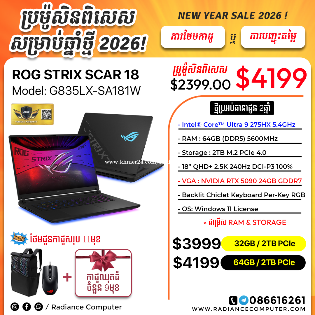 មានលក់នៅរេឌានកុំព្យូទ័រ រាល់ការជាវ Laptop និងទទួលបាន ការតម្លើង Software+ Game ឥតគិតថ្លៃ Lifetime ================== ☎️𝐂𝐚𝐥𝐥 𝐍𝐨𝐰: 086616xxxClick To Call- 011616xxxClick To Call 👉𝐖𝐨𝐤𝐢𝐧𝐠 𝐓𝐢𝐦𝐞: 8:00am - 6:30pm (Mon-Sun) 👉𝐓𝐢𝐤𝐓𝐨𝐤: https://www.tiktok.com/@radiancecomputer 🌐𝐖𝐞𝐛𝐬𝐢𝐭𝐞: https://www.radiancecomputer.com/#promotion 💬𝐓𝐞𝐥𝐞𝐠𝐫𝐚𝐦: 086616xxxClick To Call https://t.me/radiancecomputerkh 👉𝐓𝐞𝐥𝐞𝐠𝐫𝐚𝐦 𝐂𝐡𝐚𝐧𝐧𝐞𝐥: https://t.me/radiancesale 🗺ទីតាំង: ក្រោយវិទ្យាល័យជាស៊ីមសាមគ្គី 🗺Map : https://maps.app.goo.gl/aqncarjP8VPA7vLE9 =========================