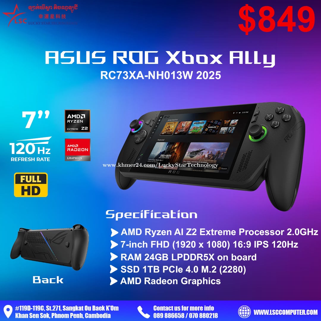 - CPU AMD Ryzen AI Z2 Extreme Processor 2.0GHz (24MB cache, up to 5.0GHz, 8 core, 16 Threads) - 7-inch FHD (1920 x 1080) 16:9 IPS 120Hz - RAM 24GB LPDDR5X on board - SSD 1TB PCIe 4.0 M.2 (2280) - VGA AMD Radeon Graphics - Ports: 1x 3.5mm Combo Audio Jack, 1x USB 3.2 Gen 2 Type-C,1x Type c support USB 4.0, 1x UHS-II mincroSD card reader - Wi-Fi 6E, Bluetooth 5.2 - Windows 11 License - Battery: 4-cell 80Wh - Weight: 715g - Color: Black