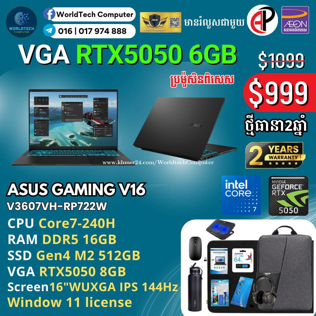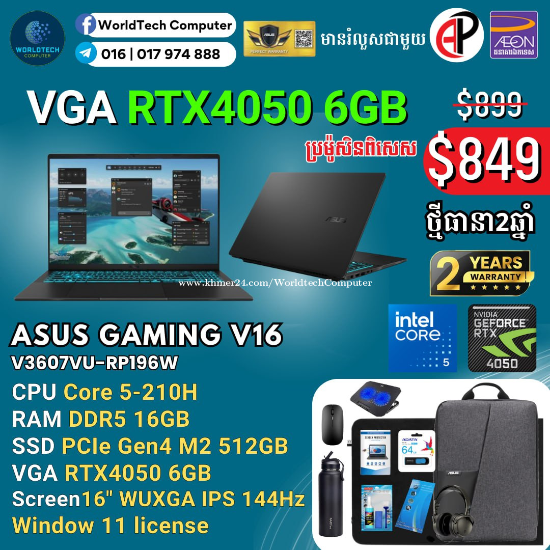 Asus TUF F16 Core5-210H 8G M2 512G RTX3050 6G 16" 144Hz New2025=799$ Asus TUF F16 Core5-210H 16G M2 512G RTX3050 6G 16" 144Hz New2025=829$ Asus TUF F16 Core5-210H 16G M2 512G RTX4050 6G 16" 144Hz New2025=899$ Asus TUF F16 i7-14650HX 16G M2 1TB RTX5050 8G 16" 165Hz New2025=1199$ Asus TUF F16 i7-14650HX 16G M2 1TB RTX5060 8G 16" 165Hz New2025=1299$ Asus TUF F16 i7-14650HX 16G M2 1TB RTX5070 8G 16" 165Hz New2025=1449$ New Warranty 2years (Perfect Warranty 1year) ទីតាំងហាង: ផ្ទះ39Eo ផ្លូវ257 ទឹកល្អក់3 ទួលគោក ភ្នំពេញ (ខាងលិចស្តុបទេពផនប្រហែល 300ម)។ Telegram: 017974xxxClick To Call , Tel : 016 | 017974xxxClick To Call