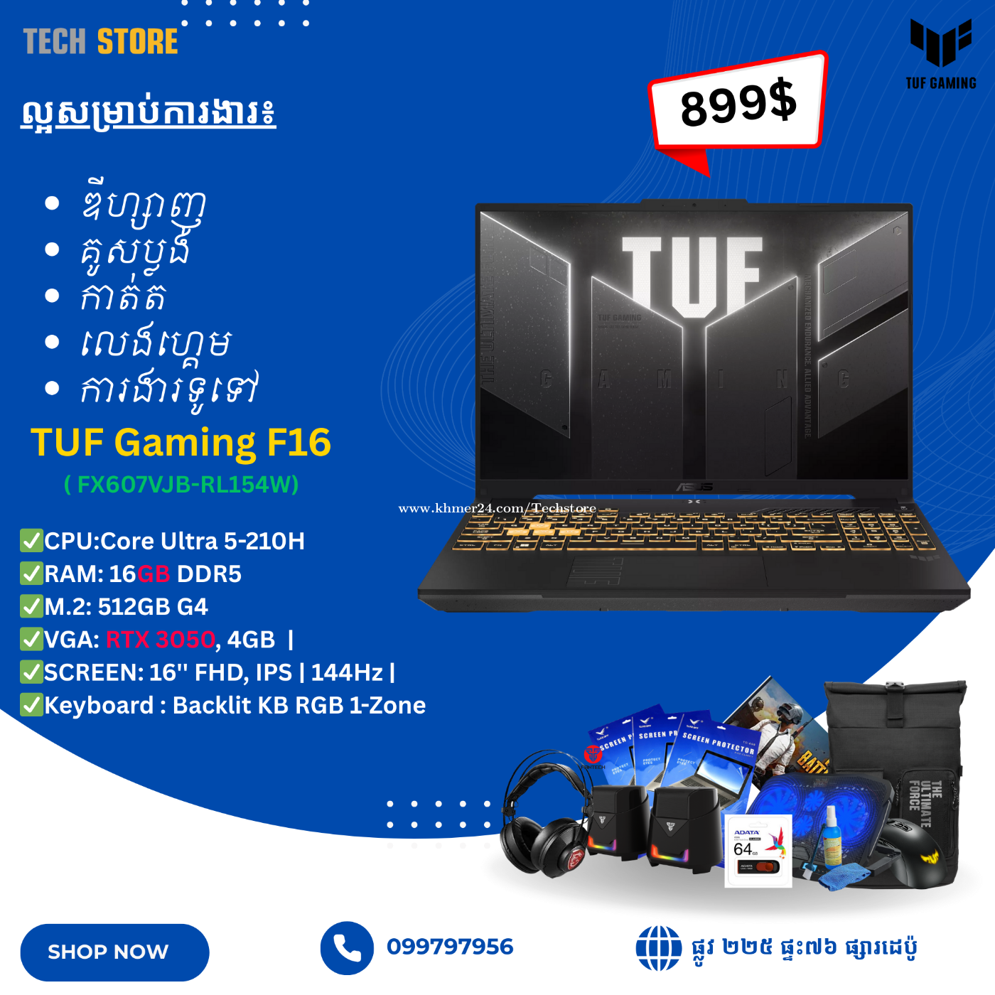 ASUS TUF FX607VJB-RL154W-Mecha Gray Core™ 5 210H / RTX™ 3050 ,6GB GDDR6 / 16 "FHD+ 16:10 (1920 x 1200, WUXGA) 144Hz IPS-level / DDR5 16GB / 512GB G4 / Backlit Chiclet Keyboard 1-Zone RGB With Copilot key / P309 TUF GAMING M3,TUF backpack / Win11 / 2 Years (1Year Perfect Warranty)