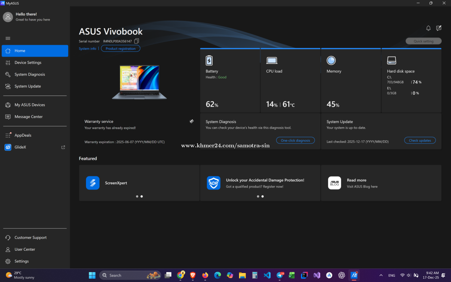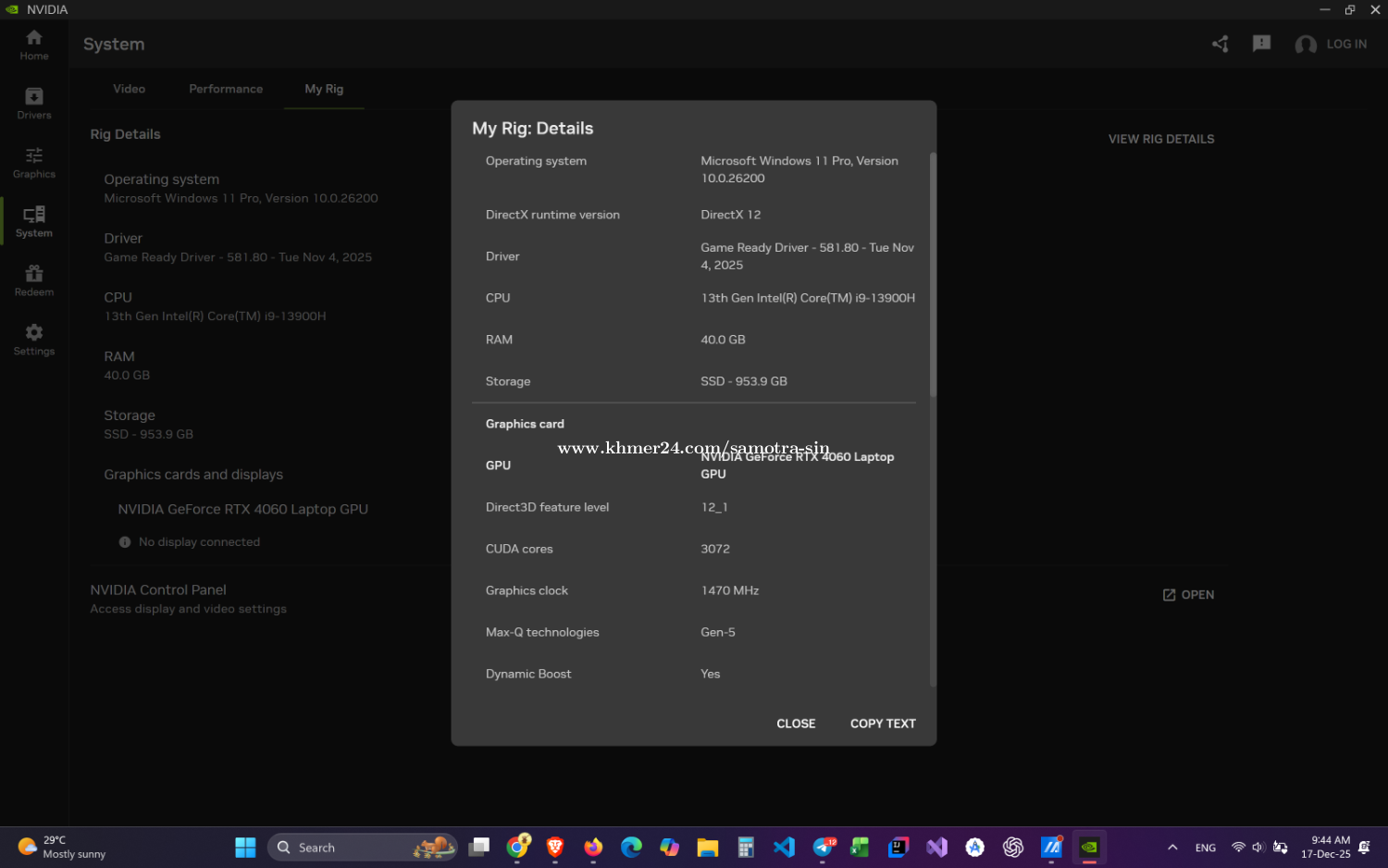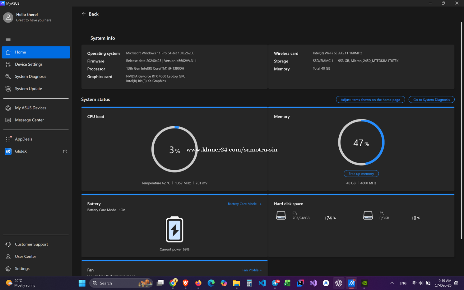 Laptop ប្រើខ្លូនឯងផ្ទាល់តែម្តង។ Laptop មួយនេះផ្តោតសំខាន់លើ Content Creator។ Display: 16inch OLED Screen 3.2K CPU: 13th Gen Intel(R) Core(TM) i9-13900H (2.60 GHz) RAM: 40GB (On-board 8GB and 32GB DDR5) GPU: RTX4060 8GB