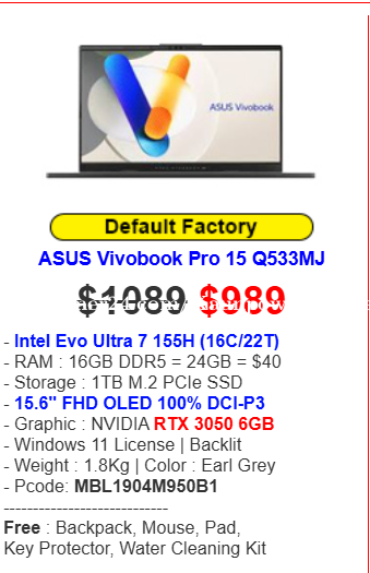 ASUS Vivobook Pro 15 Q533MJ - Intel Evo Ultra 7 155H (16C/22T) - RAM : 16GB DDR5 = 24GB = $40 - Storage : 1TB M.2 PCIe SSD - 15.6" FHD OLED 100% DCI-P3 - Graphic : NVIDIA RTX 3050 6GB - Windows 11 License | Backlit - Weight : 1.8Kg | Color : Earl Grey - Pcode: MBL1904M950B1