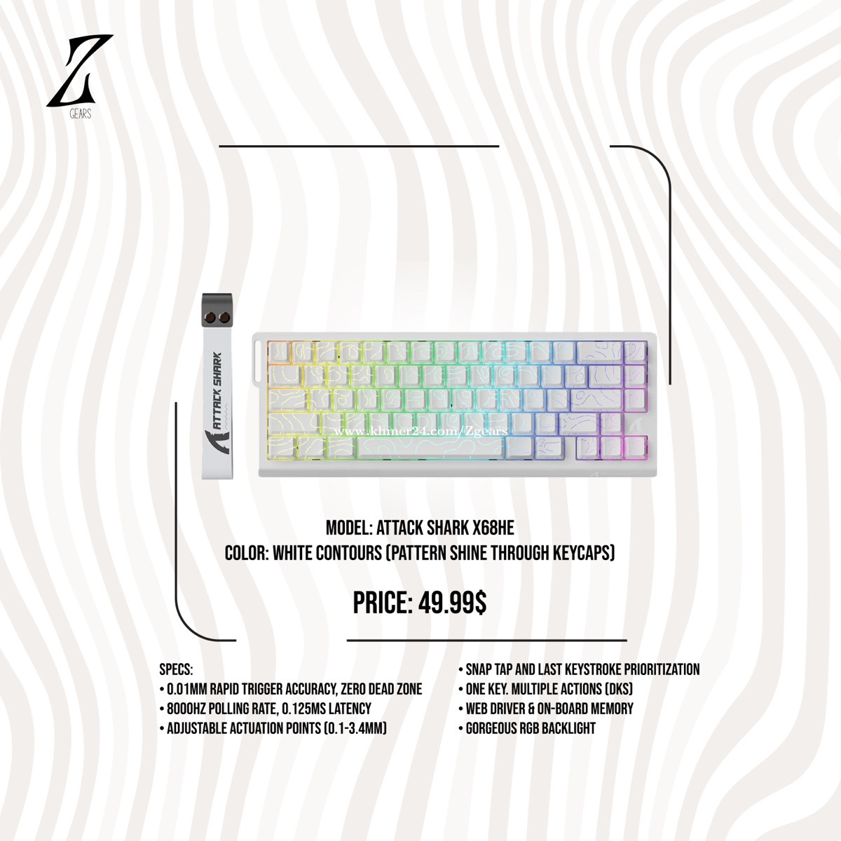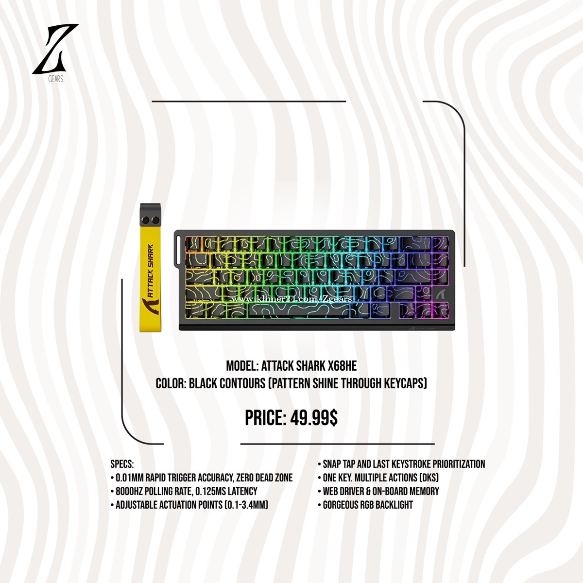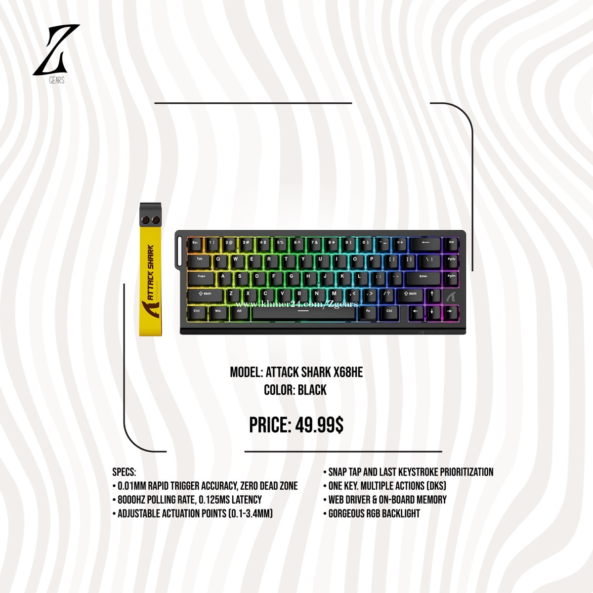 ATTACK SHARK X68 HE Rapid Trigger Keyboard Magnetic Switch 60% Wired 8KHz Magnetic Keyboard With 0.01mm RT Accuracy, Support RT/Snap Tap/DKS/MT/TGL Specs • 0.01mm Rapid Trigger Accuracy, Zero Dead Zone • 8000Hz Polling Rate, 0.125ms Latency • Adjustable Actuation Points (0.1-3.4mm) • Snap tap and Last Keystroke Prioritization • One Key. Multiple Actions (DKS) • Web Driver & On-board Memory • Gorgeous RGB Backlight