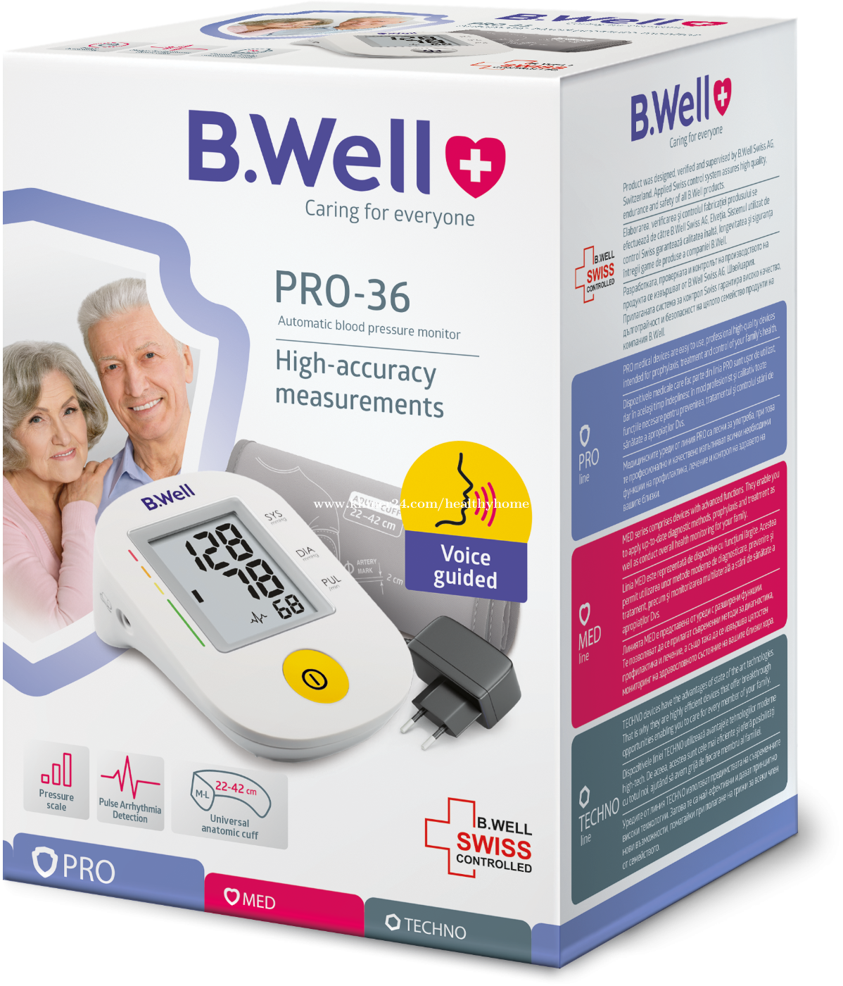 B.Well offers a convenient solution for people with impaired vision: a measuring device with voice capabilities to help monitor blood pressure. Automatic blood pressure monitor B.Well PRO-36 says instructions and results aloud. The device has a smart design and is convenient and easy to use. Just press the one large, bright button to measure pressure. PRO-36 features a measurement history, volume adjustment, and tip scale to help assess pressure levels. The anatomic cuff design ensures comfortable and accurate measurements. The universal size fits any body constitution.
