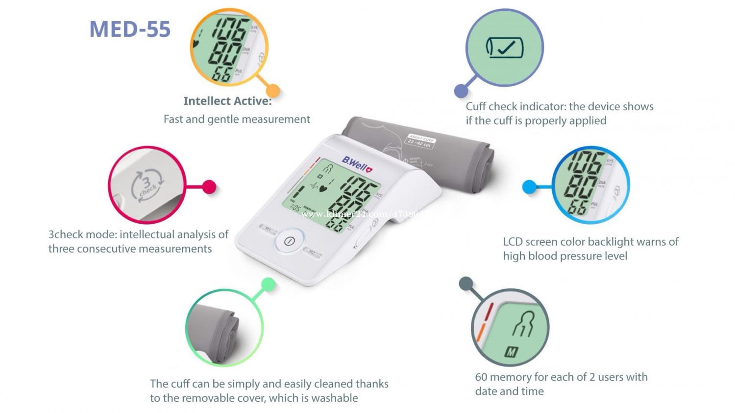 B.Well MED-55 automatic blood pressure monitor provides an advanced measurement accuracy. Pressure readings can be affected by excitement, fatigue, and presence of arrhythmia. Therefore, doctors recommend to make at least 2 measurements and calculate the average value. 3Check technology was created in accordance with recommendations of the ESH Definition and Classification of Blood Pressure Levels on blood pressure control.