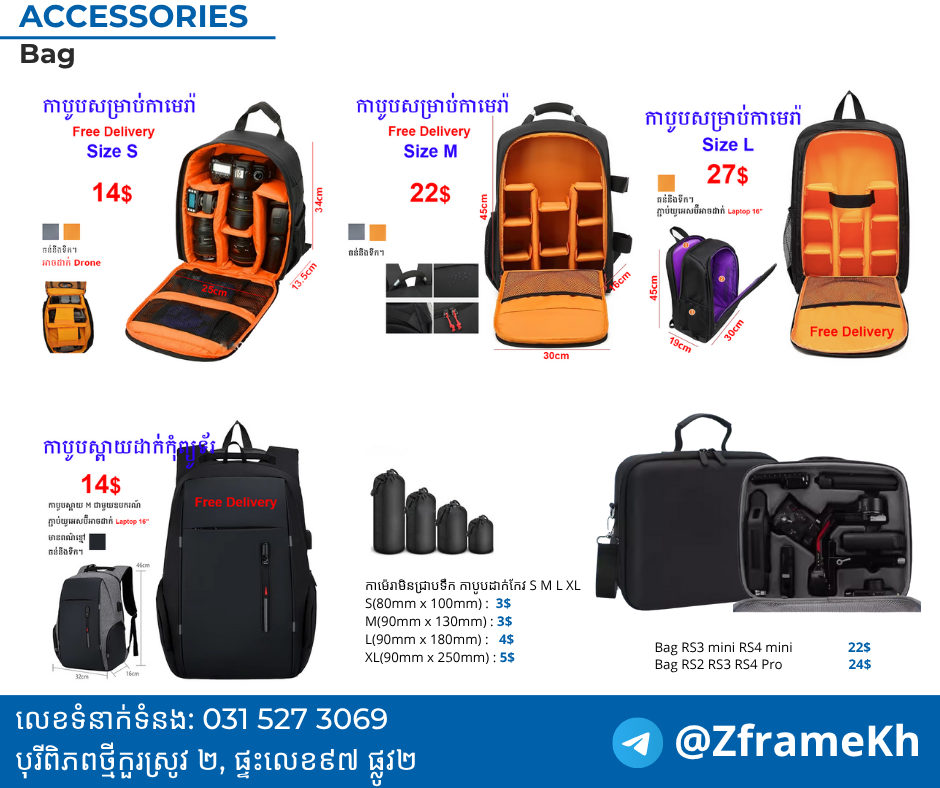 Backpack camera កាបូបសម្រាប់កាមេរ៉ា Free Delivery 🔥 Camera bag Size S : 14$ 🔥 Camera bag Size M : 22$ 🔥 Camera bag Size L : 27$ 🔥 Laptop bag 16" : 14$ តម្លៃពិសេសខែកក្កដា! Free delivery +24H to PNH, 24/48h in all 25 province មានក្នុងស្ចុកស្រាប់ អាចទាក់ទងមកបានឫ ឆាតមកផេកក៌បាន៕ ហេីយមានលក់ ដូចជា សំភារៈសម្រាប់កាមេរ៉ា កំព្យូរទ័រ មានតម្លៃសមរម្យ: 👉លេខទំនាក់ទំនង: 012387xxxClick To Call / 012382xxxClick To Call 👉តេលេក្រាម : t.me/ZframeKh 👉https://www.facebook.com/zframekh Google maps : https://g.co/kgs/ukpxkbg 📍បុរីពិភពថ្មីកួរស្រូវ ២, ផ្ទះលេខ៩៧ ផ្លូវ២ 📍Borey New World Kor Srov II, #97 street 2 #zframe #camera #filmmaking #filmmaker #Sony #lumix #blackmagic #nikonphotography #fujifilm #zframekh #sigma #cinema #phnompenh #Cambodia #Backpack