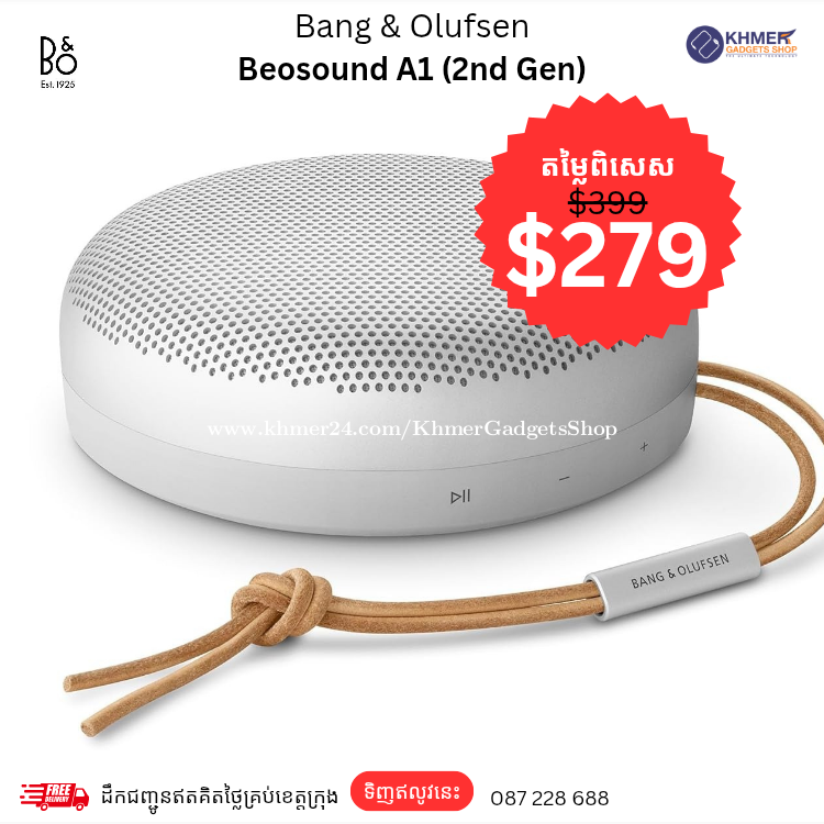 โ Promotion Price $279 โ Brand New Sealed Box โ Original ๐ฏ % โ Authenticity by connecting to the B&O App โ Available Color Grey Mist โ Free Delivery ๐ฅTelegram https://t.me/KhmerGadgetsSHOP โ๏ธ087228xxxClick To Call About this item โ POWERFUL SOUND: Enjoy Bang & Olufsen Signature Sound when youโre on the move with a peak power of 2x140 watts contained in a sleek, small speaker. โ WATERPROOF SPEAKER: Share your soundtrack on the go, with a durable and wireless lightweight speaker designed for life on the road, at home or by the pool. โ LISTEN LONGER: Improved battery power so you can enjoy music and speakerphone calls for up to 18 hours at increased volume, longer on low settings. โ SLEEK YET STRONG: Designed to travel, the tough aluminum dome is dust- and water-resistant making in an elegantly self-contained portable Bluetooth speaker. โ ALEXA SPEAKER: An intuitive user interface combined with built-in voice control and Amazon Alexa means youโre always in control. โ CUSTOMIZABLE SOUND EQ: Customize your audio preferences with Beosonic Tuning, now available in the Bang & Olufsen app. Highlights โ Bluetooth Audio Streaming โ 3.5" Woofer & 0.6" Tweeter โ 60W of Total Power โ IP67 Water & Dustproof Rating โ Works with Amazon Alexa โ Up to 18-Hour Rechargeable Battery โ Customizable EQs via Bang & Olufsen App โญFeatures โ Enjoy music nearly anywhere with the 2nd generation black anthracite Bang & Olufsen Beosound A1 Portable Bluetooth Speaker. The Beosound A1 is designed to disperse sound all around it to help you hear your music clearly. It's equipped with a 3.5" woofer and a 0.6" tweeter, each powered by 30W amplifiers. Bluetooth technology is onboard, so you can stream your favorite songs from compatible devices. You can control the speaker via Amazon Alexa if your paired device has the Alexa app onboard. Wireless control is also available via the Bang & Olufsen app, which lets you set the EQ to your sound preference as well. The built-in rechargeable battery lasts up to 18 hours. โ True360 Sound The Beosound A1 uses True360 omnidirectional sound technology for an enhanced sound experience, while the multipoint feature lets two devices connect and control the music. โ Long Battery Life With its 18-hour battery life and lightweight design, you can take the Beosound A1 on your next adventure. โ Fully Dustproof and Waterproof The Beosound A1 features an IP67 rating, so it's resistant to dust and sand, keeping it safe at the beach or near the bathtub. โ Speakerphone Enjoy clear voice calls thanks to onboard speakerphone functionality. Bluetooth 5.1 and three internal microphones provide enhanced connectivity for online meetings and hands-free calls. โ Amazon Alexa Compatibility Play a song, check the news, or organize your day with just your voice. With music playing at normal listening volume, you won't need to raise your voice to be heard. Alexa functionality requires the Beosound A1 to be paired via Bluetooth with a device with the Amazon Alexa app installed. ๐Additional Features โ Recommended for 500 to 300 ftยฒ rooms or small social gatherings in the office and mid-sized rooms around the home โ Discrete 30W amplifiers for each driver โ Designed for 360ยฐ sound dispersion โ 92 dB maximum SPL; 62 dB maximum bass SPL 2Stereo pairing with a second Beosound A1 โ Customizable & preset EQ via the Bang & Olufsen app โ Pearl-blasted aluminum construction with waterproof leather โ 3000mAh battery โ 2.75-hour charging time โ Battery LED โ Precise power status available via the Bang & Olufsen app โ USB-C for charging, speakerphone, and streaming โ On-device controls include power, Bluetooth connect, microphone, play/pause, and volume up/down buttons โ Apple Fast Pair, Google Fast Pair, Microsoft Swift Pair โ Initial setup via the Bang & Olufsen app is recommended INCLUDED IN THE BOX -Beosound A1 2nd Gen -Quick Start Guide -USB-C to USB-A cable