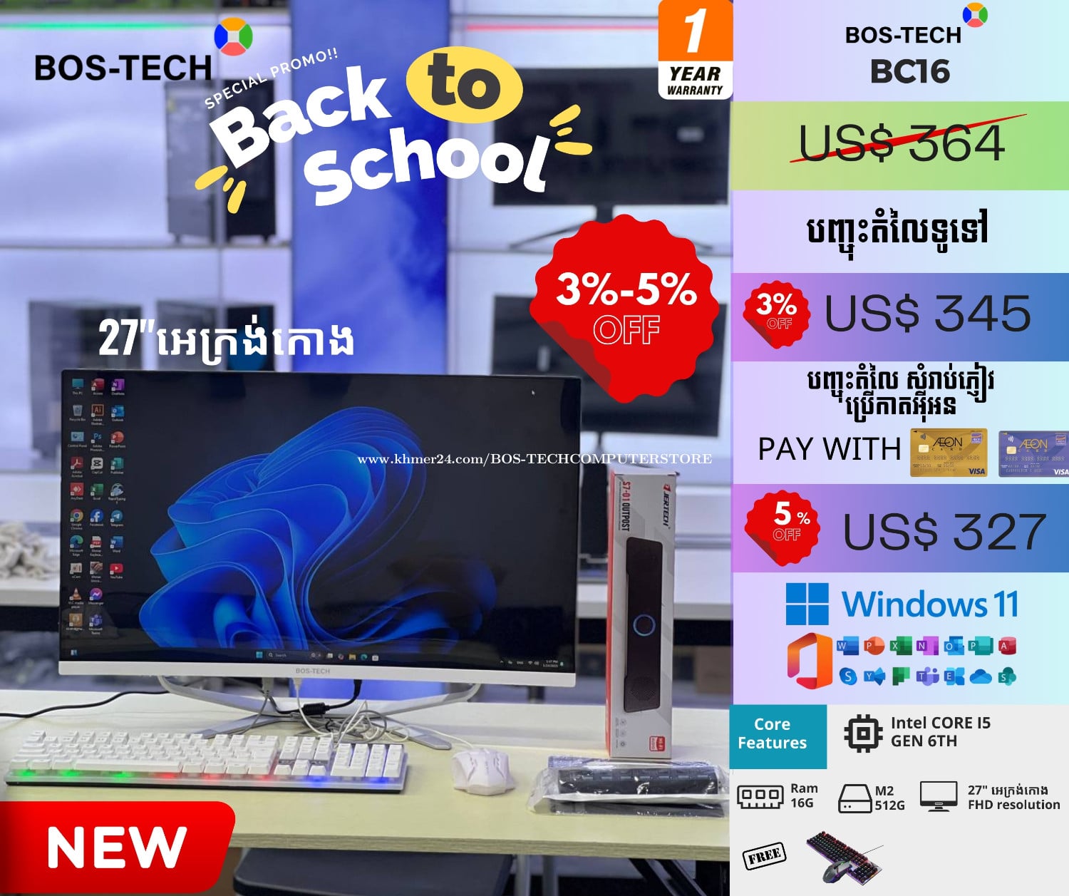 (working , designing,gaming) New Computer (AIO) original model Bc16 Model : ALL IN ONE (BOS-TECH) NEW CPU : Core i5 6th Generation RAM 16GB DDR4 (Original) SSD 520GB SATA ( Window 10 Pro ) wifi+bluethooth +camera 3.0mp Super Slim and Super Fast Speed black /white Color (Computer) Screen 27-inch FHD IPS (1920 x 1080) ✅Free : ទ្រនាប់ mouse + mouse(white) & keyboad(white) ✅ធានាជូនលេីម៉ាសុីនចំនួន1ឆ្នាំ ✅ទីតាំងទល់មុខផ្សារទំនើបស្ទឹងមានជយ័ ✅មានសេវាដឹងជញ្ជូនឥតគិតថ្លៃជូនអថិតិជន២៥ខេត្តក្រុង🚛