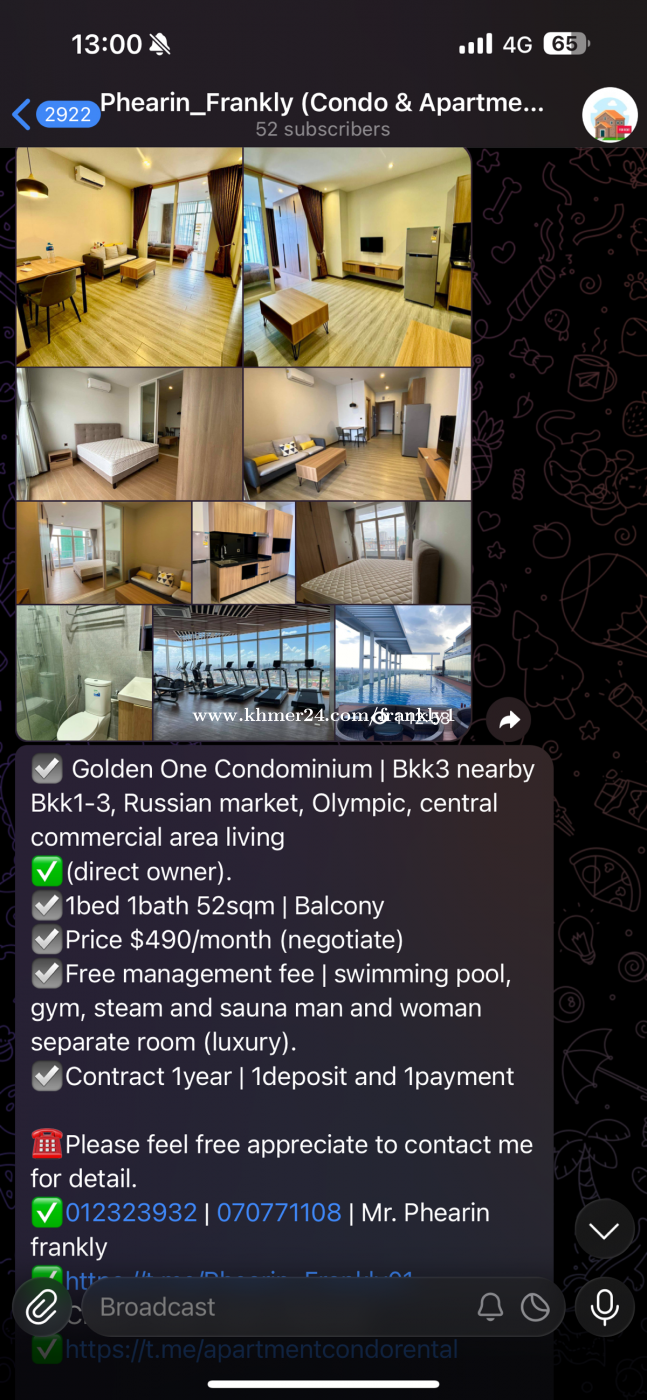 ☑️ Golden One Condominium | Bkk3 nearby Bkk1-3, Russian market, Olympic, central commercial area living ✅(direct owner). ☑️1bed 1bath 52sqm | Balcony ☑️Price $490/month (negotiate) ☑️Free management fee | swimming pool, gym, steam and sauna man and woman separate room (luxury). ☑️Contract 1year | 1deposit and 1payment ☎️Please feel free appreciate to contact me for detail. ✅012323xxxClick To Call | 070771xxxClick To Call | Mr. Phearin frankly ✅https://t.me/Phearin_Frankly01 ➡️Check other room channel ✅https://t.me/apartmentcondorental ✅012755xxxClick To Call | 010778xxxClick To Call | Ms. Meyly ✅https://t.me/meylycondo ➡️Check other room channel ✅https://t.me/mey_ly99999 ### golden one | 1bed Thanks with respectfully